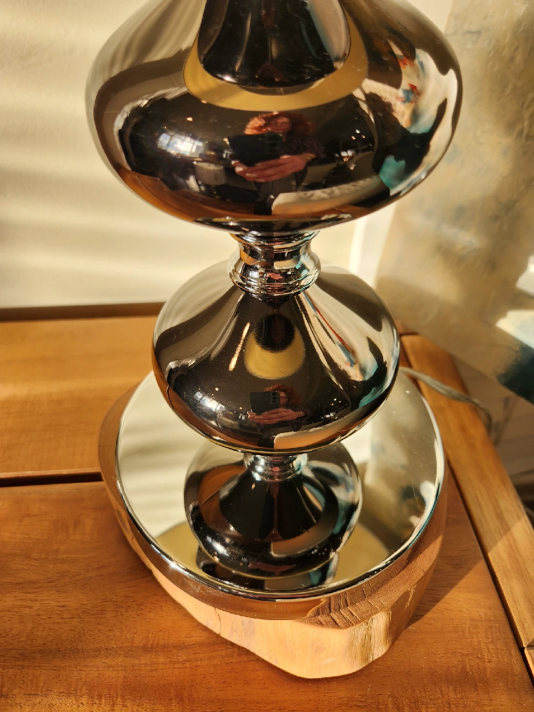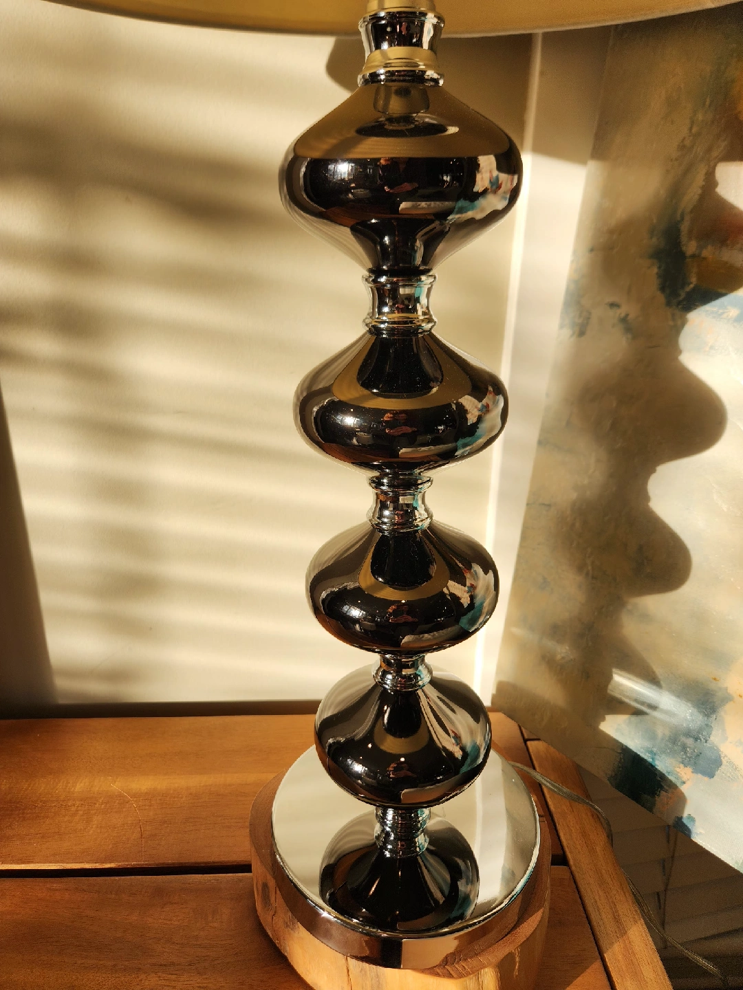 This like new Mirror surface lamp gives a boutique vibe to any space.This table lamp that would look great in any room! It features a unique chrome accent design, mirrored smokey gray mirrored peuteur base and a neutral shade. It's in great condition and ready to brighten up your space. 27 inches tall 6 inch diameter base.