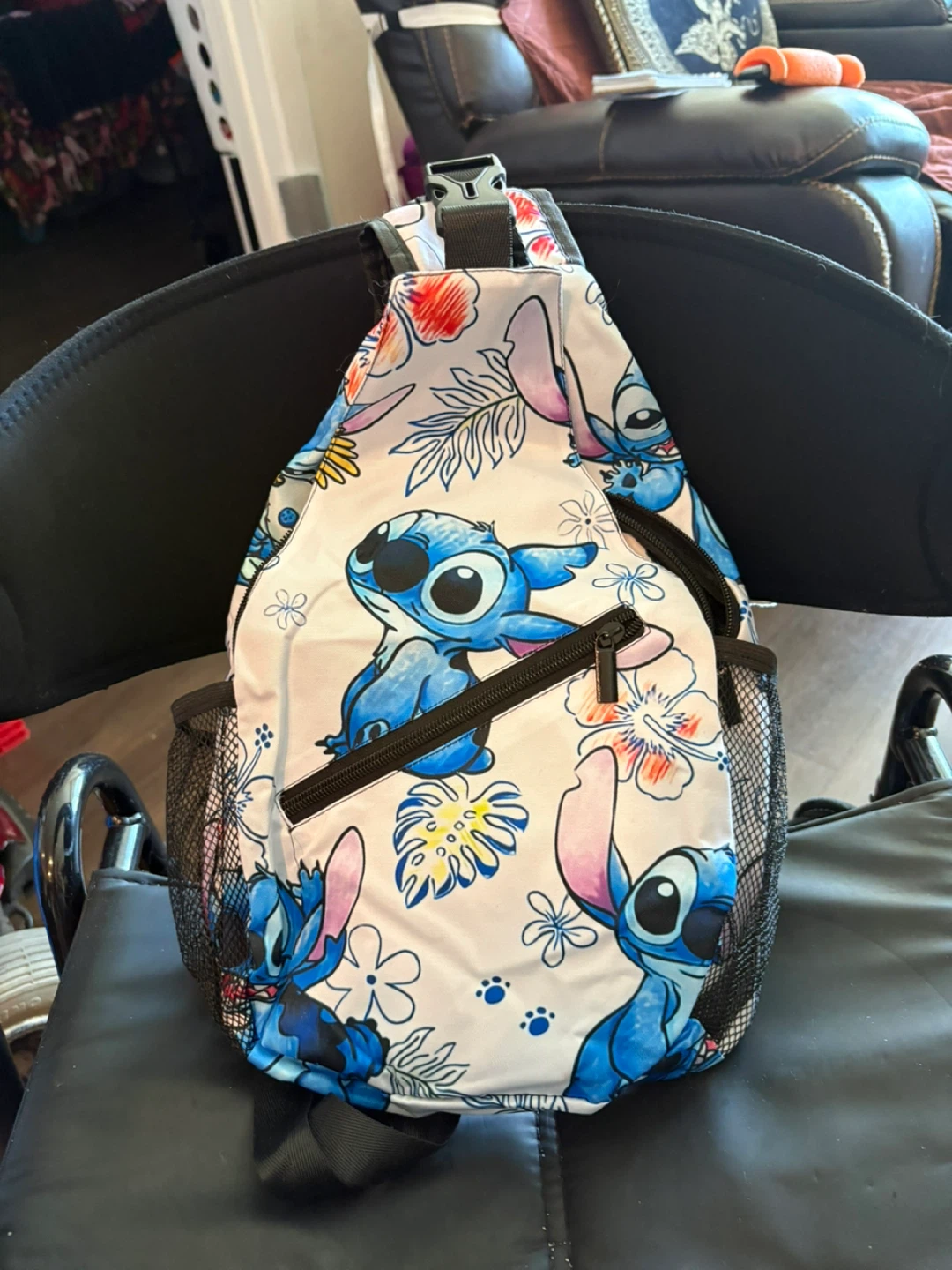Super cute sling bag featuring Lilo & Stitch! It's in great condition and perfect for carrying your essentials. The bag has a fun, colourful design with Stitch and tropical flowers on a white background. It also has black mesh side pockets and adjustable straps for comfortable wear