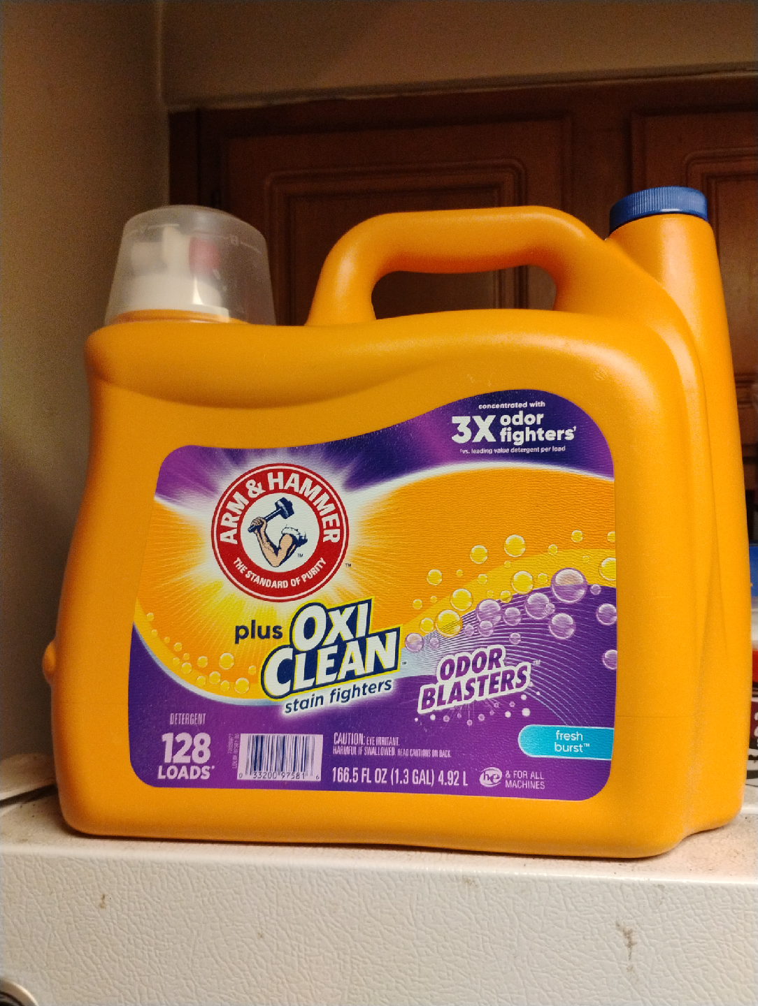I'm selling a large container of Arm & Hammer OxiClean Odor Blasters laundry detergent. It's concentrated with 3X odor fighters, versus leading value detergent per load. This detergent has 128 loads and is suitable for all machines!