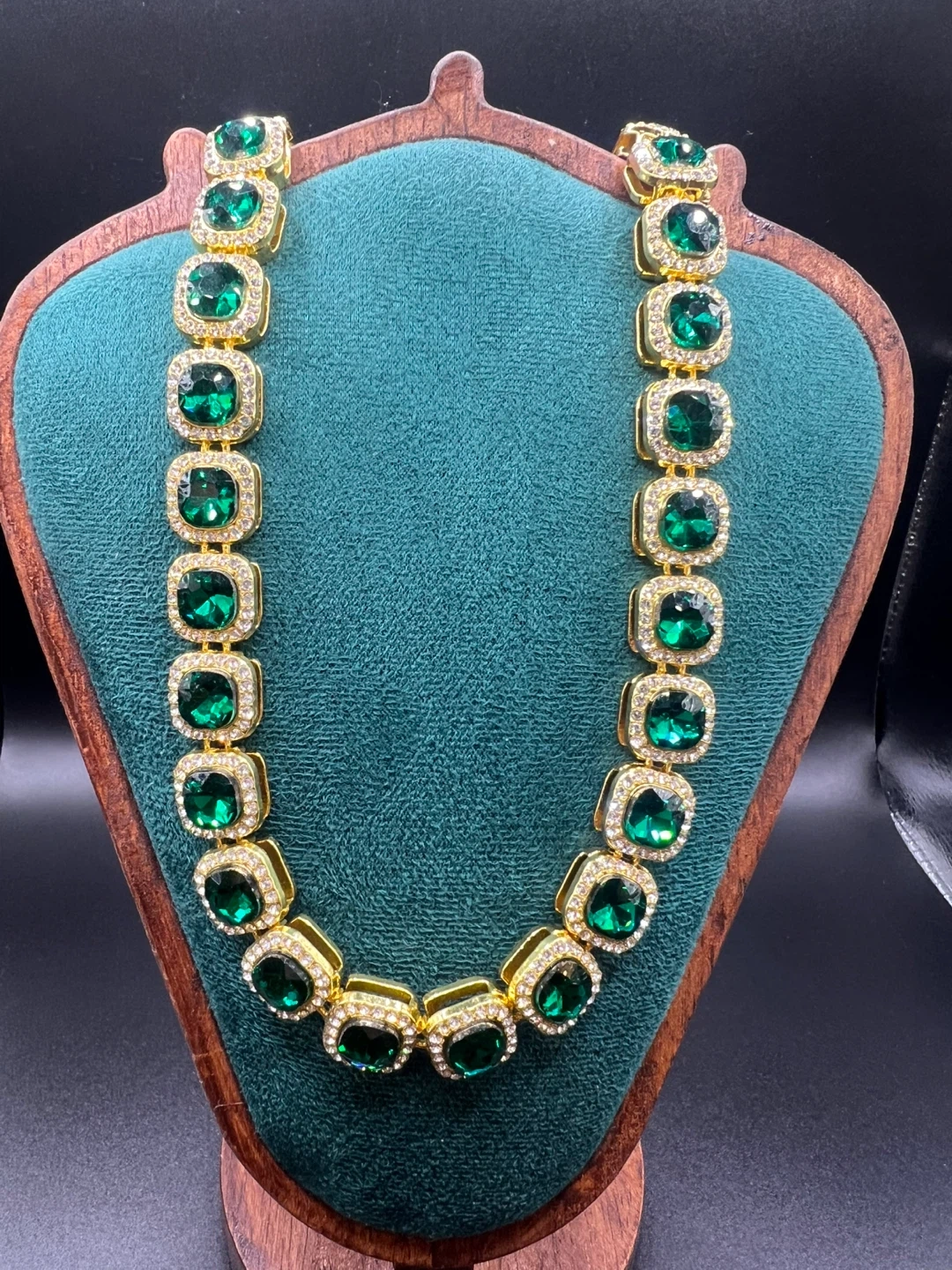 Gorgeous emerald green and gold necklace! It features a series of square-cut emerald green crystals, each surrounded by sparkling clear stones. Perfect for adding a touch of elegance to any outfit!
