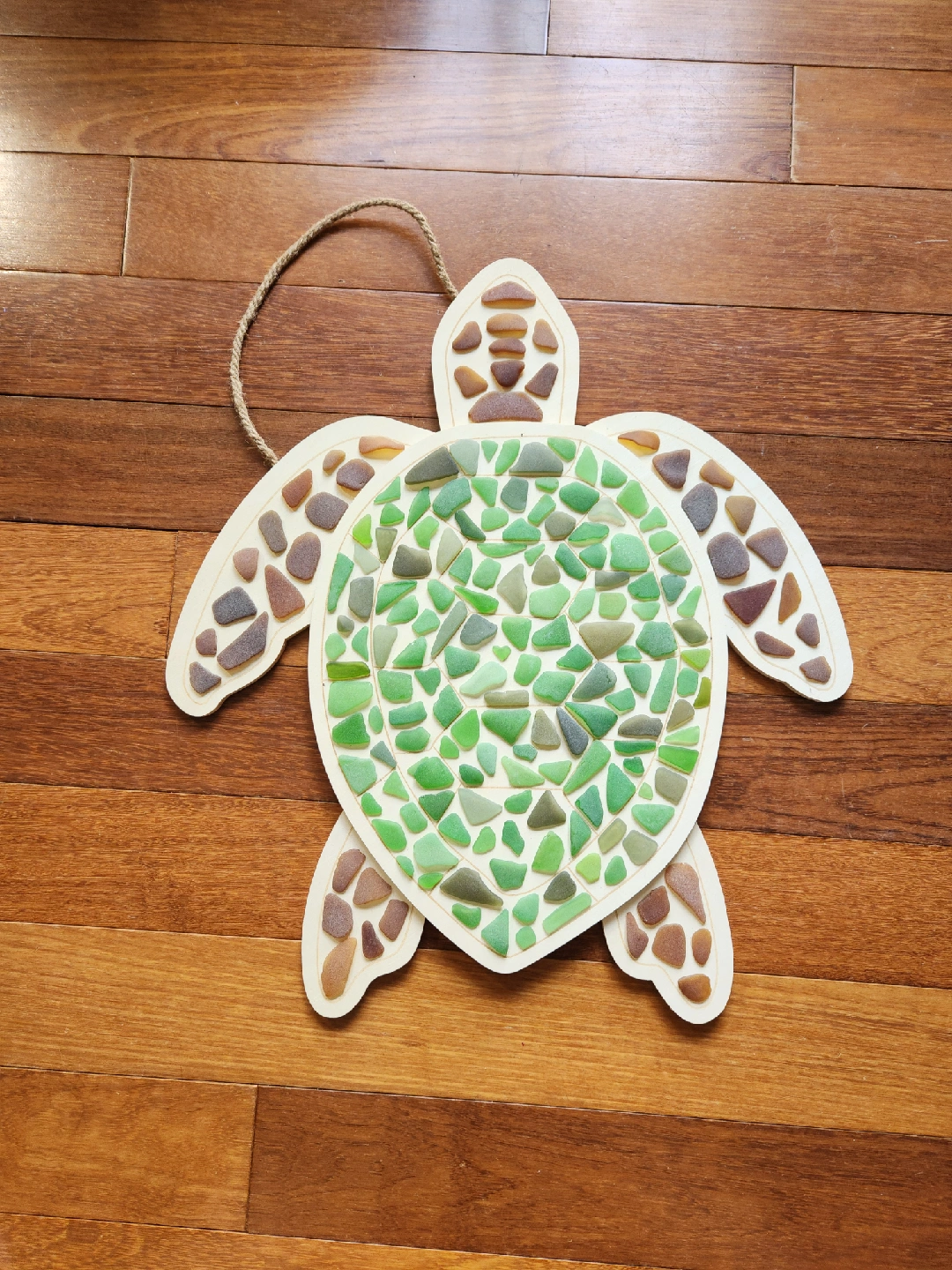 Hi, I create and sell sea glass treasures such as this sea turtle wall hanging! It features a variety of green and brown authentic sea glass pieces arranged on a wooden sea turtle. It's perfect for adding a touch of coastal charm to any room. Each piece is unique and made with love. I only accept cash and will hand deliver in Staten Island and some parts of Brooklyn.