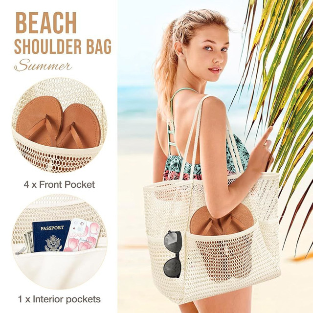 Large Mesh Beach Bag – Waterproof, Sandproof & Foldable Tote with Pockets. Stay organized and stylish at the beach or pool with this lightweight mesh tote bag in Light Beige! Perfect for carrying all your summer essentials — towels, sunscreen, water bottles, and more!