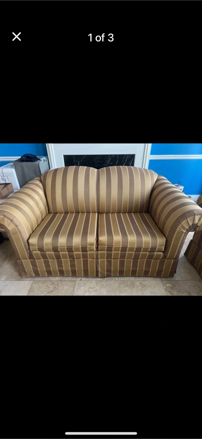 Selling a loveseat couch with a striped pattern in shades of brown and gold. It's in good condition and would be a great addition to any living space!