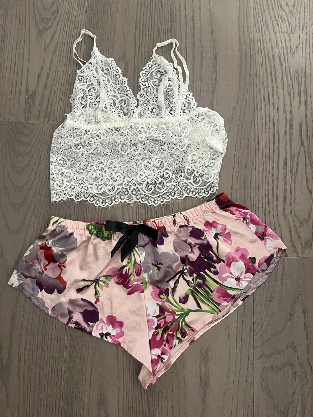 Cute set with a white lace bralette and pink floral shorts. Perfect for lounging or sleepwear!