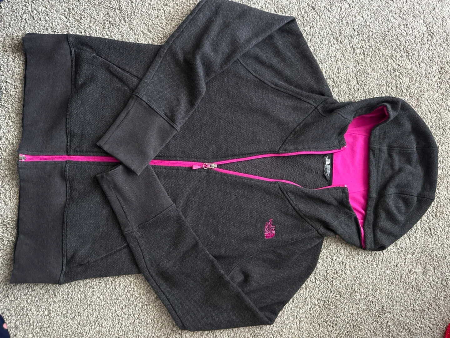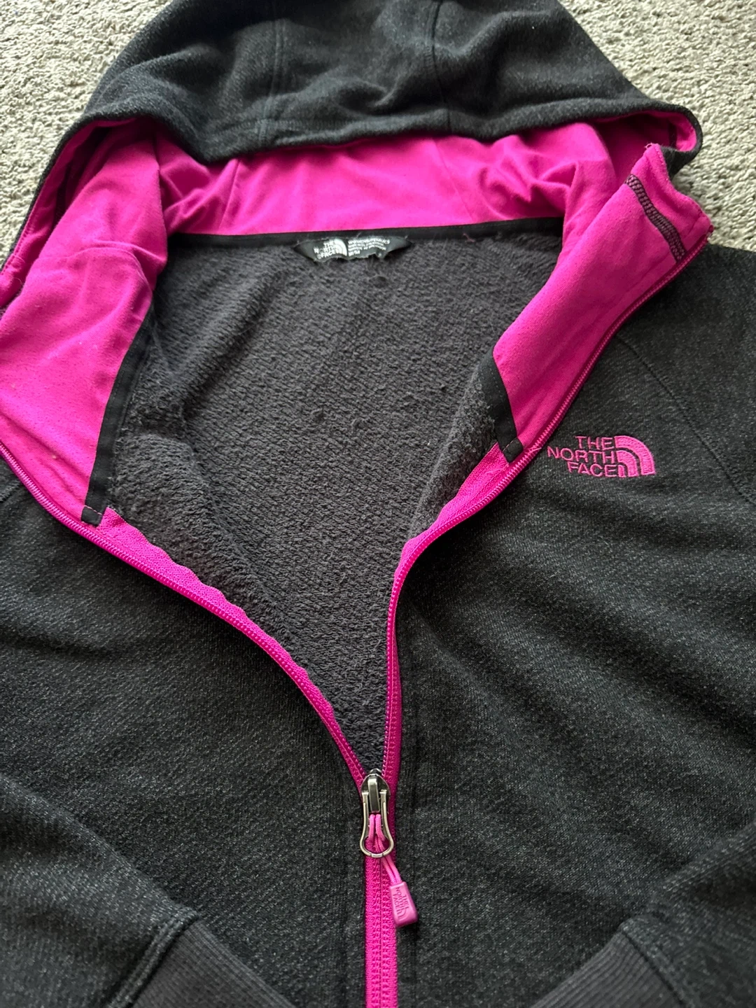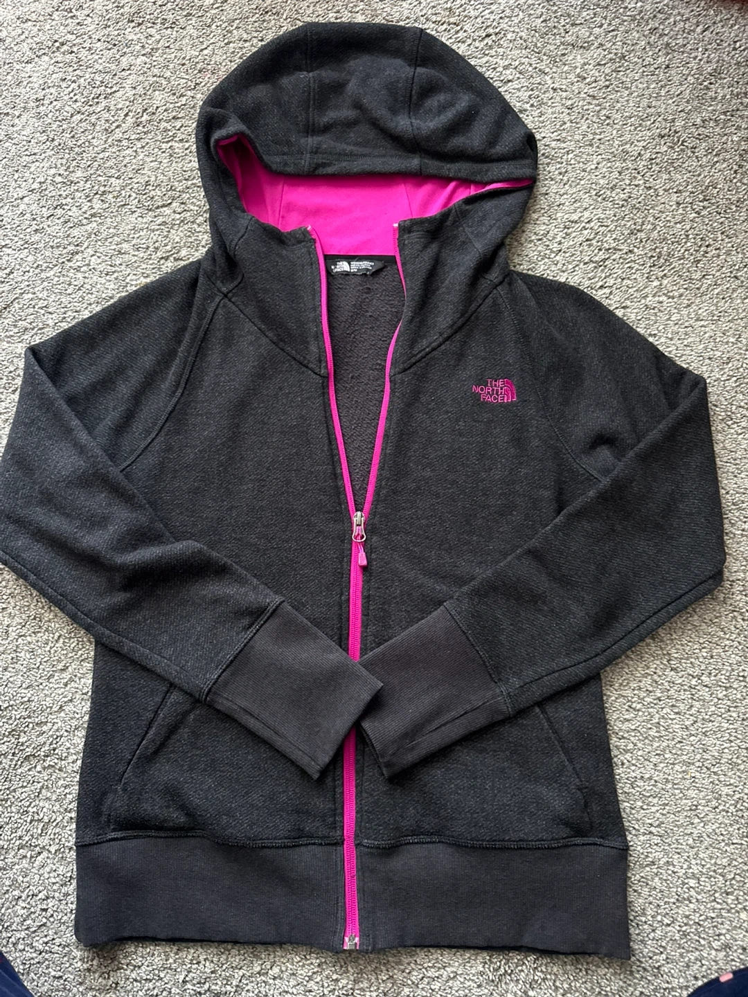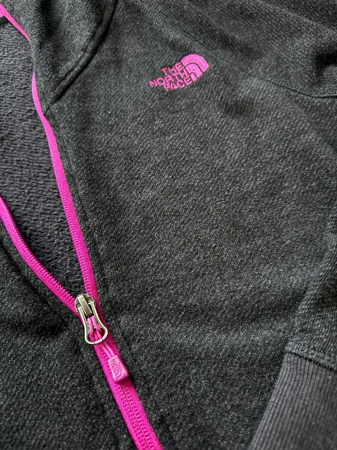 Cozy up in this The North Face full zip hoodie! It's a stylish grey colour with a pop of pink on the inside of the hood and zipper. Perfect for layering or wearing on its own for a casual, comfy look