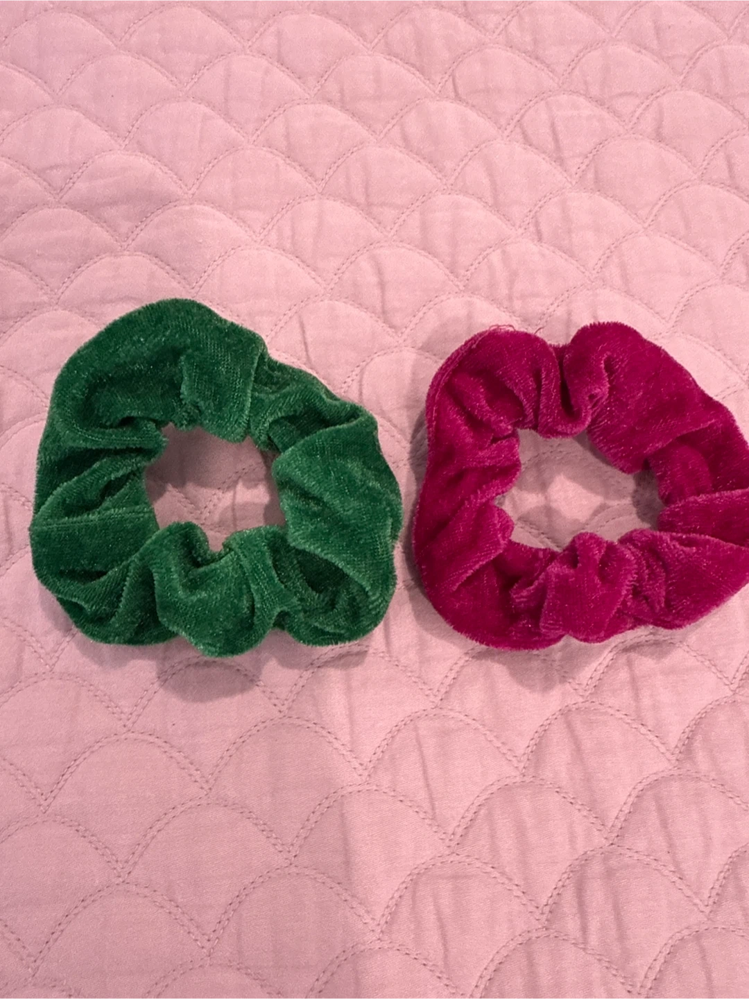 39Selling two cute velvet scrunchies! One is a lovely green color, and the other is a vibrant pink. They're both in great condition and ready to add a pop of color to your hair!