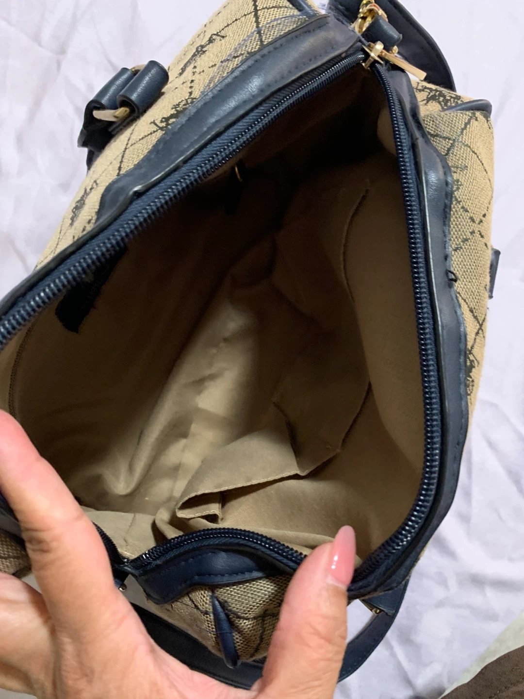 Selling a U.S. Polo Assn. barrel bag. It features a distinctive pattern and navy blue accents. The bag has a zipper closure and a convenient shoulder strap. Perfect for everyday use!