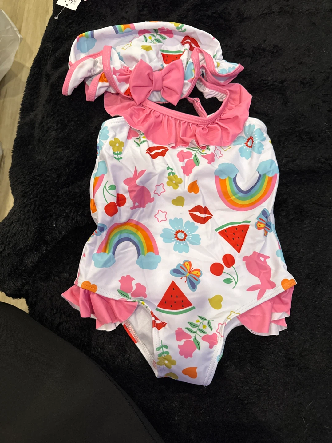 Super cute girls swimsuit with a matching hat! The swimsuit has a fun and colourful pattern with rainbows, watermelons, bunnies, and flowers. Perfect for a day at the pool or beach!
