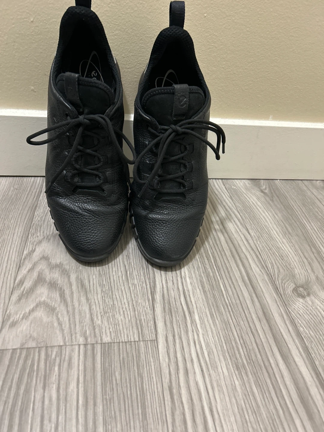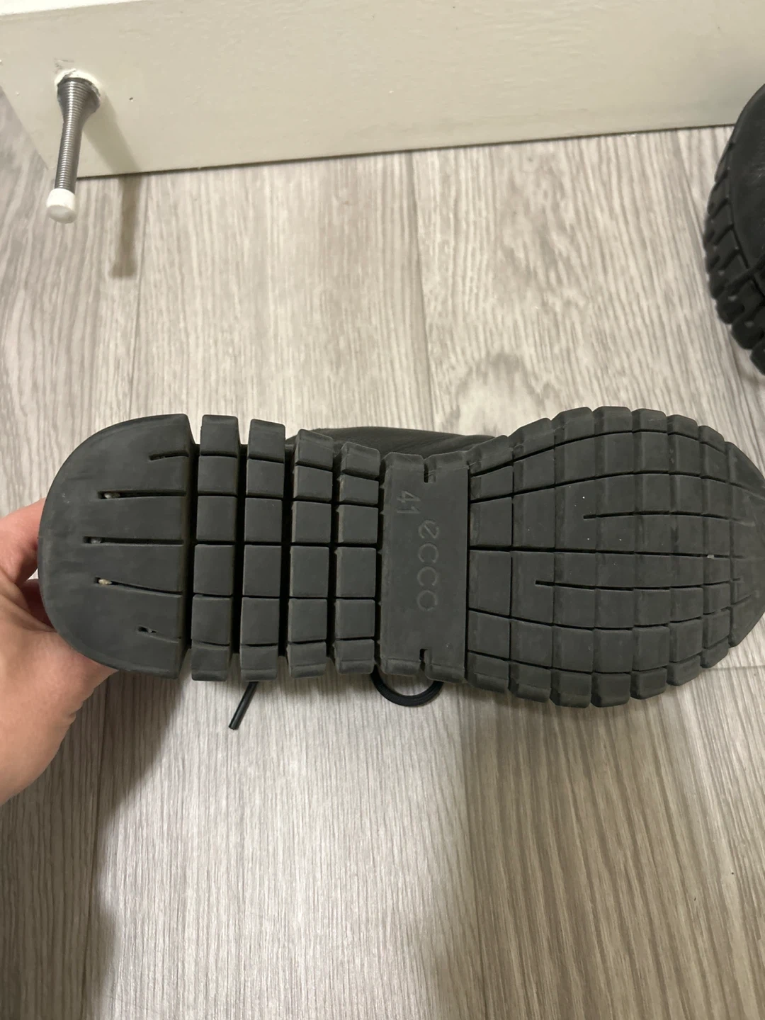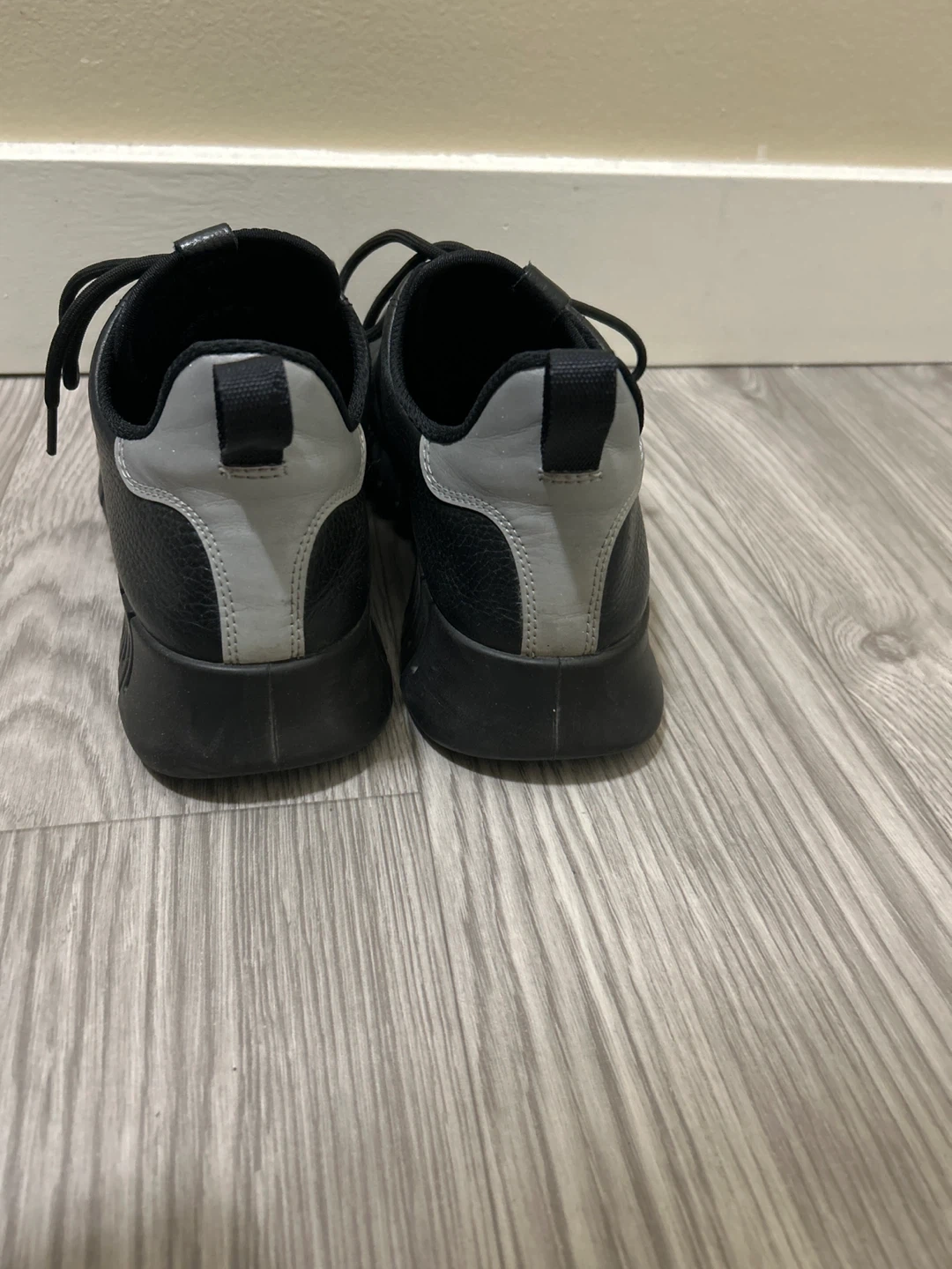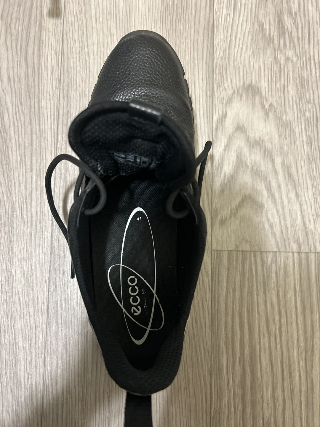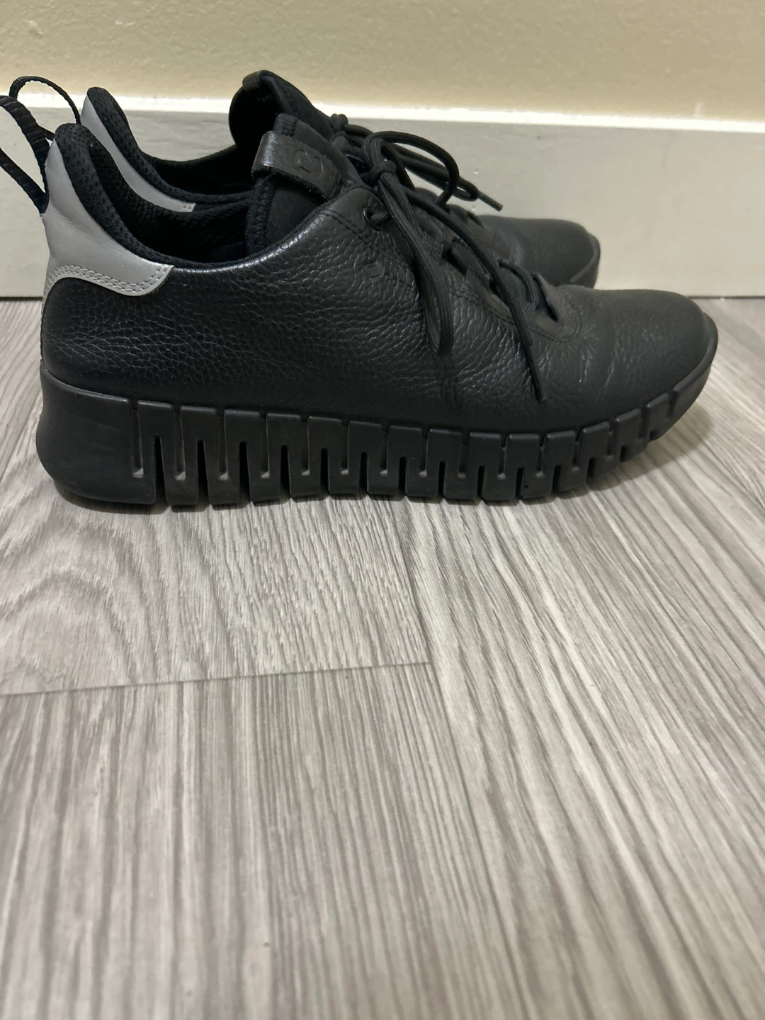 Selling a pair of Ecco leather sneakers in size 41, which is a US size 8! They're a stylish and comfortable choice for everyday wear. The sneakers are black with a unique sole design and some grey detailing on the back. They're in great condition and ready for a new home