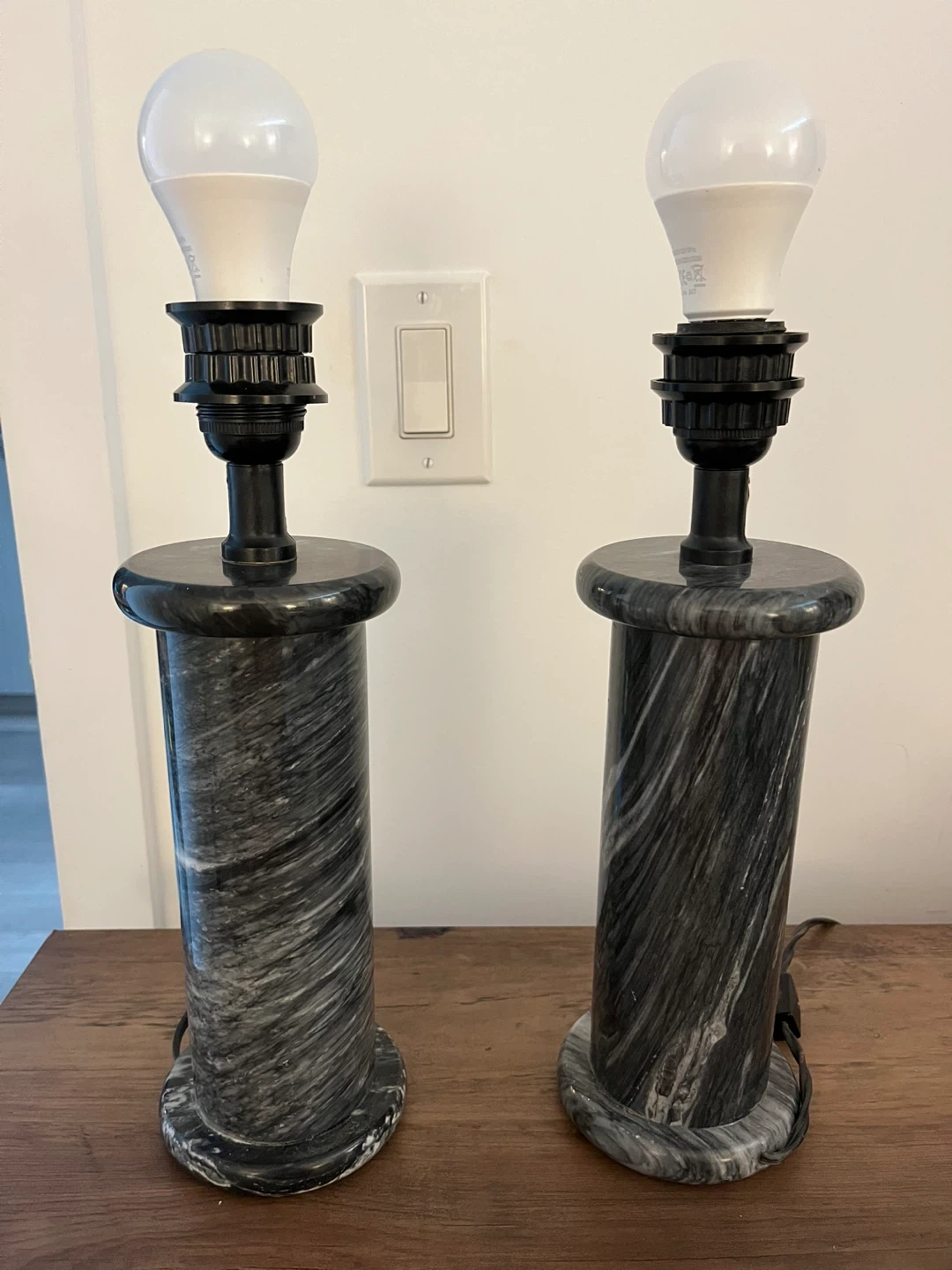 Selling a set of two stylish marble table lamp bases. They're solid, heavy and in great condition and would add a touch of elegance to any room. The lamps feature a beautiful marble pattern and are perfect for bedside tables or living room decor. Bulbs are included