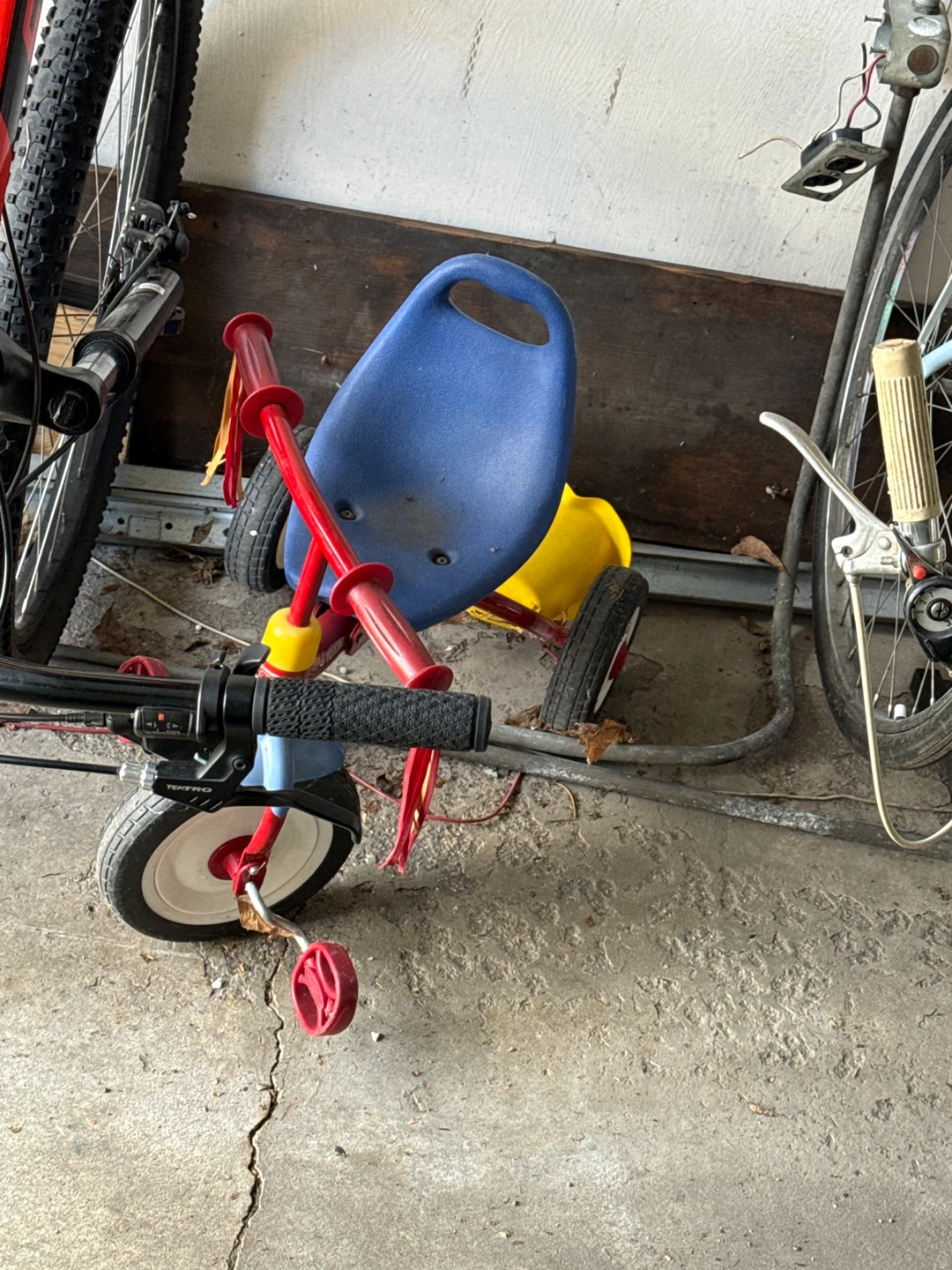 Selling a used kids tricycle with a blue seat, red handlebars, and a yellow back. It's a fun little ride for your child!