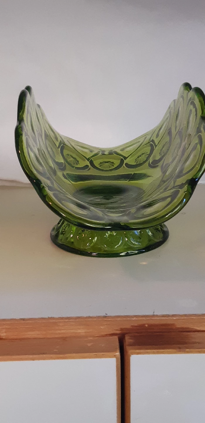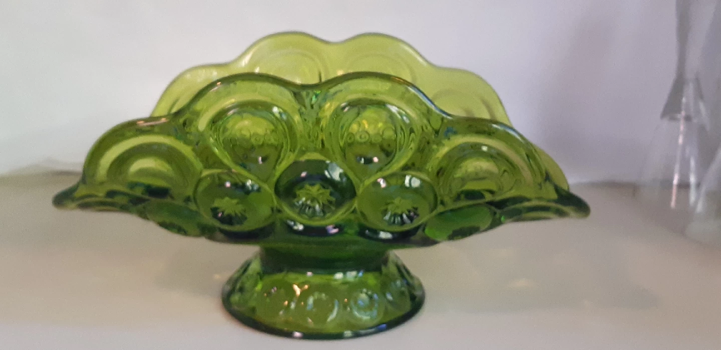 This beautiful vintage green glass bowl features the Moon and Star pattern! It's great as a decorative item or for holding fruit. It's in great condition and ready for a new home!