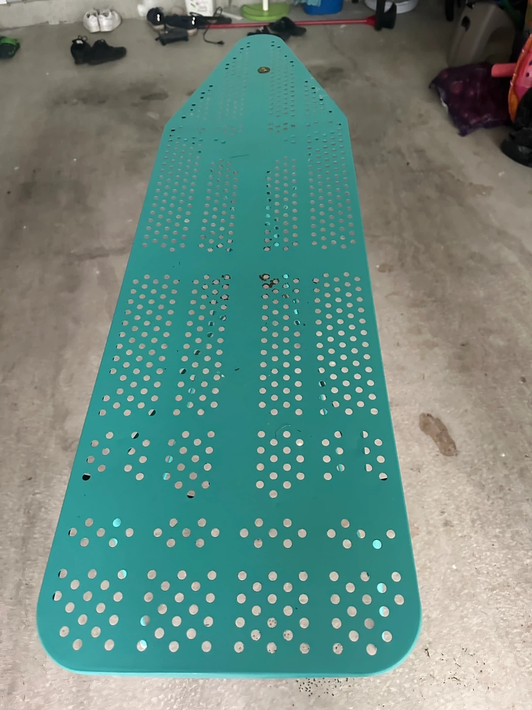 Selling a teal-coloured ironing board! It's in great condition and ready to help you tackle your ironing pile. The board is a lovely shade of teal and has a perforated surface. Perfect for any home!
