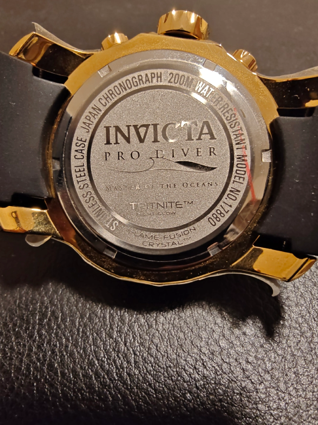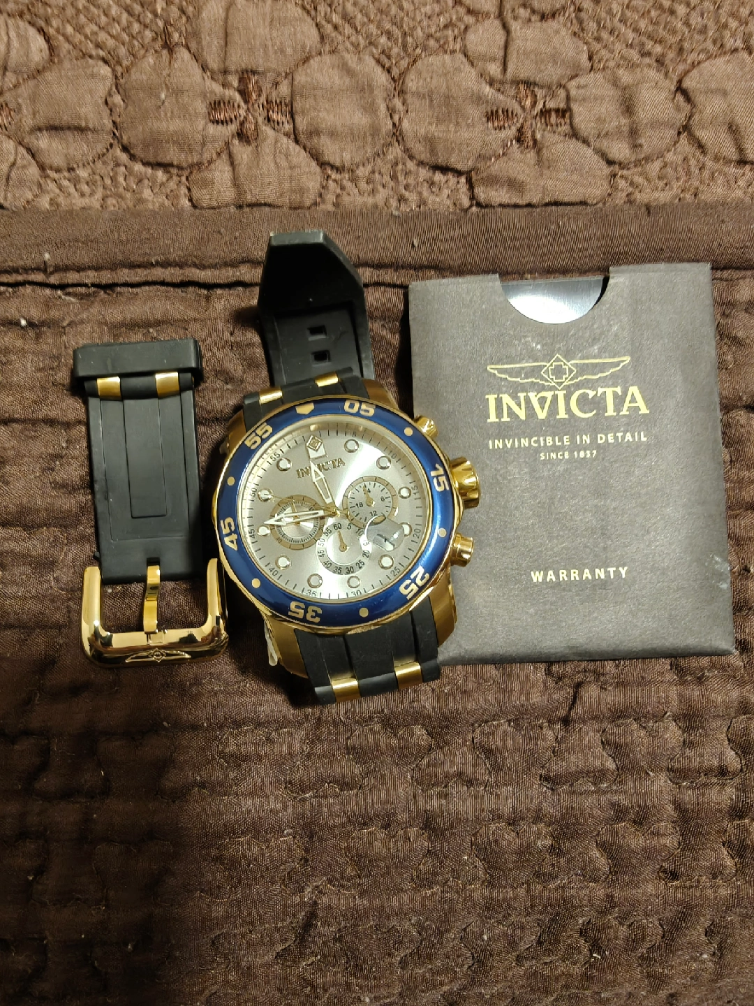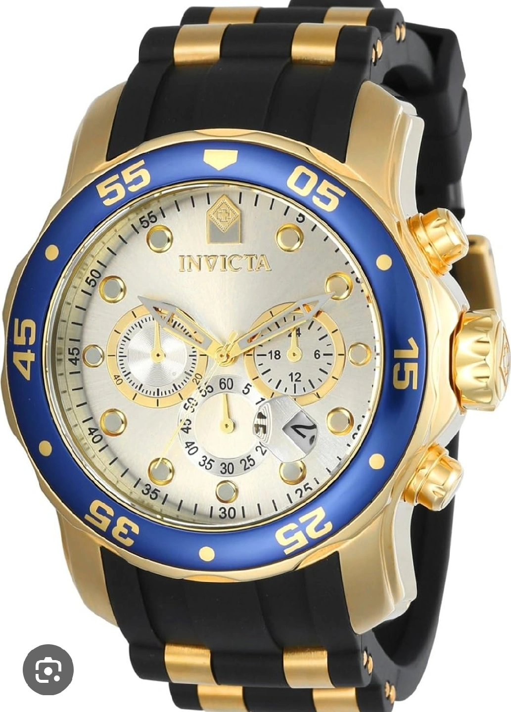 The Invicta Men's Pro Diver 17880 is a blue and gold-tone polyurethane and stainless steel chronograph watch, available for CA$194.18. It can be purchased on Walmart and eBay.