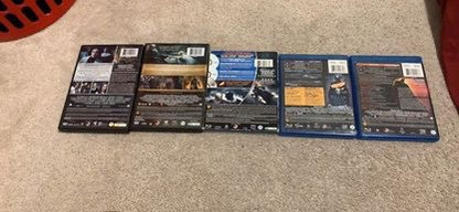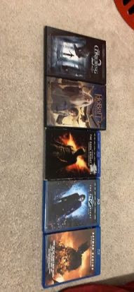 A collection of six movies on DVD and Blu-ray. Includes The Hobbit, The Lord of the Rings, and Batman Begins. Movies - $13