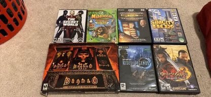 Collection of eight PC games. Titles include Diablo II, Rise of Legends, SimCity 4, and more. Various genres represented. Pre-owned. See images for specific titles.