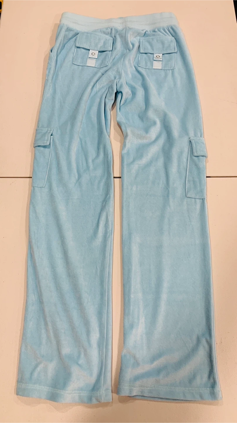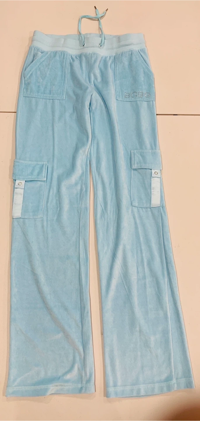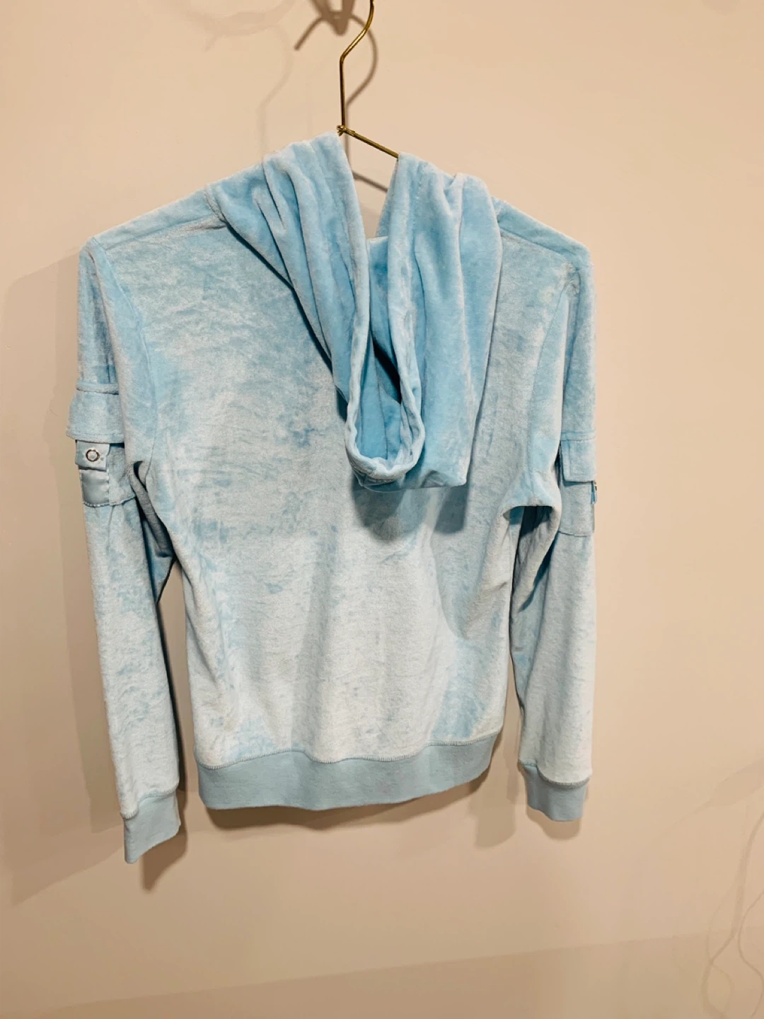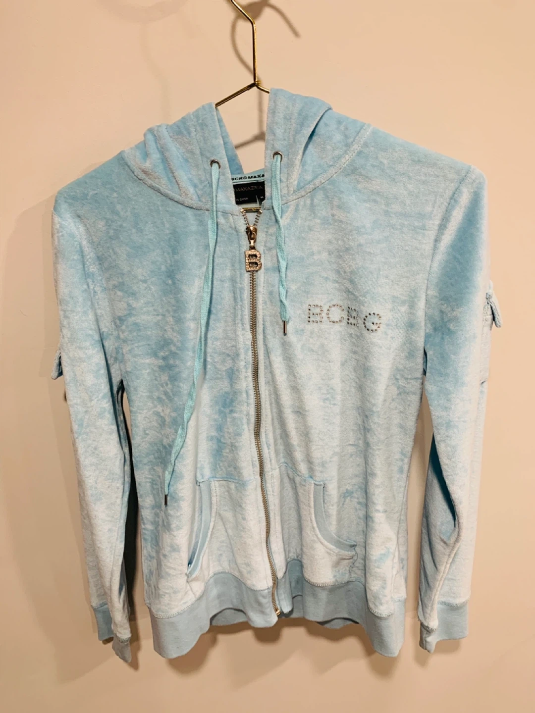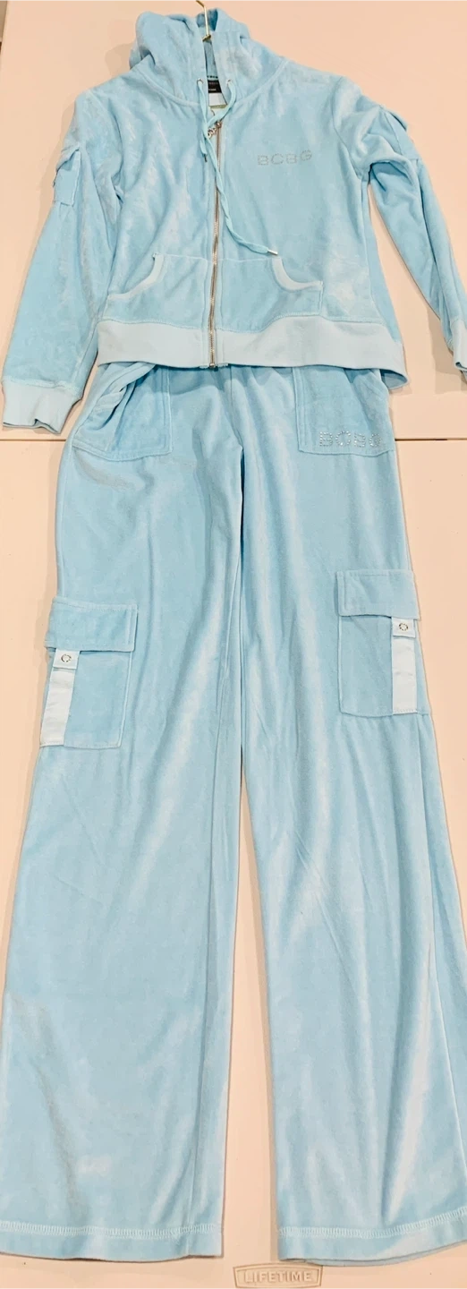Selling a cute BCBG velour tracksuit in a light blue color! It includes a zip-up hoodie and matching pants. Perfect for a comfy and stylish look.