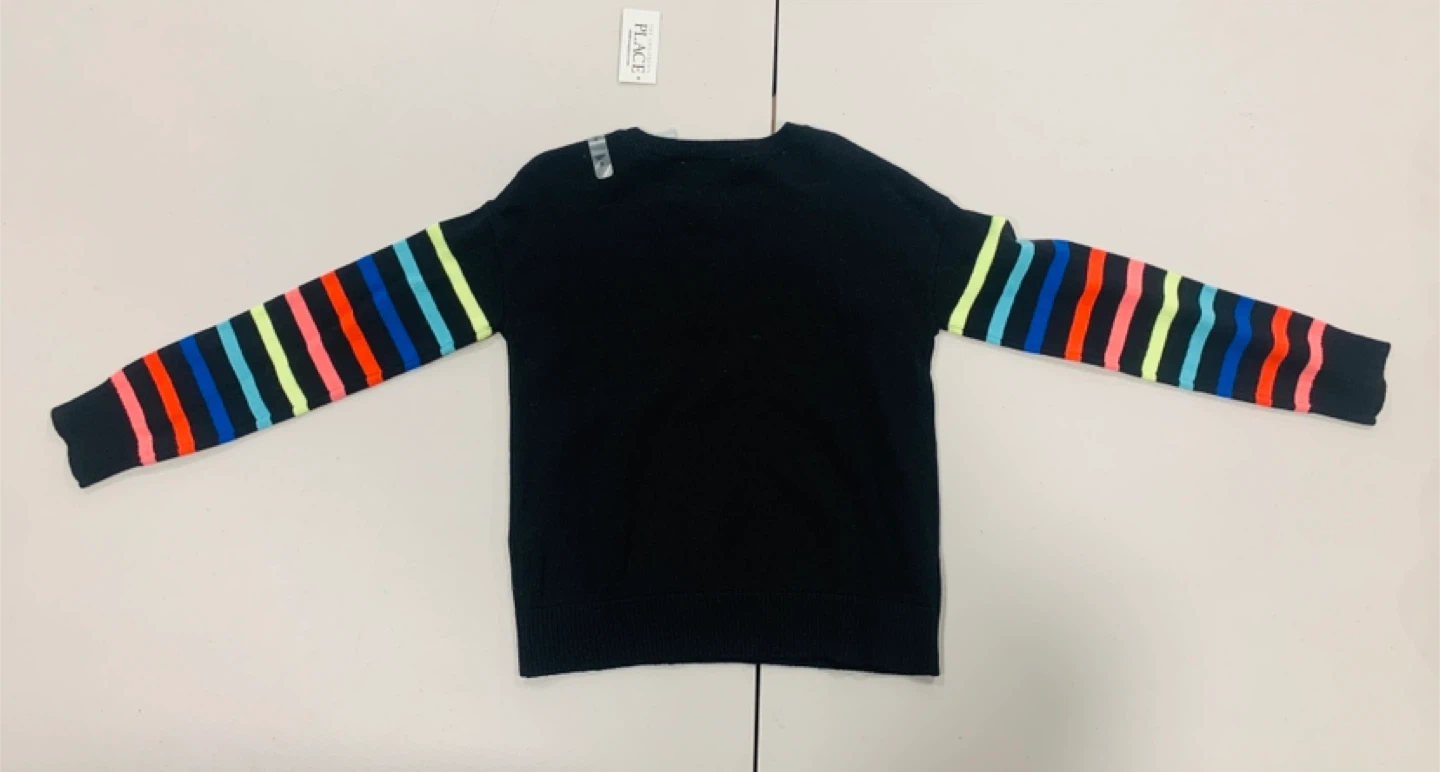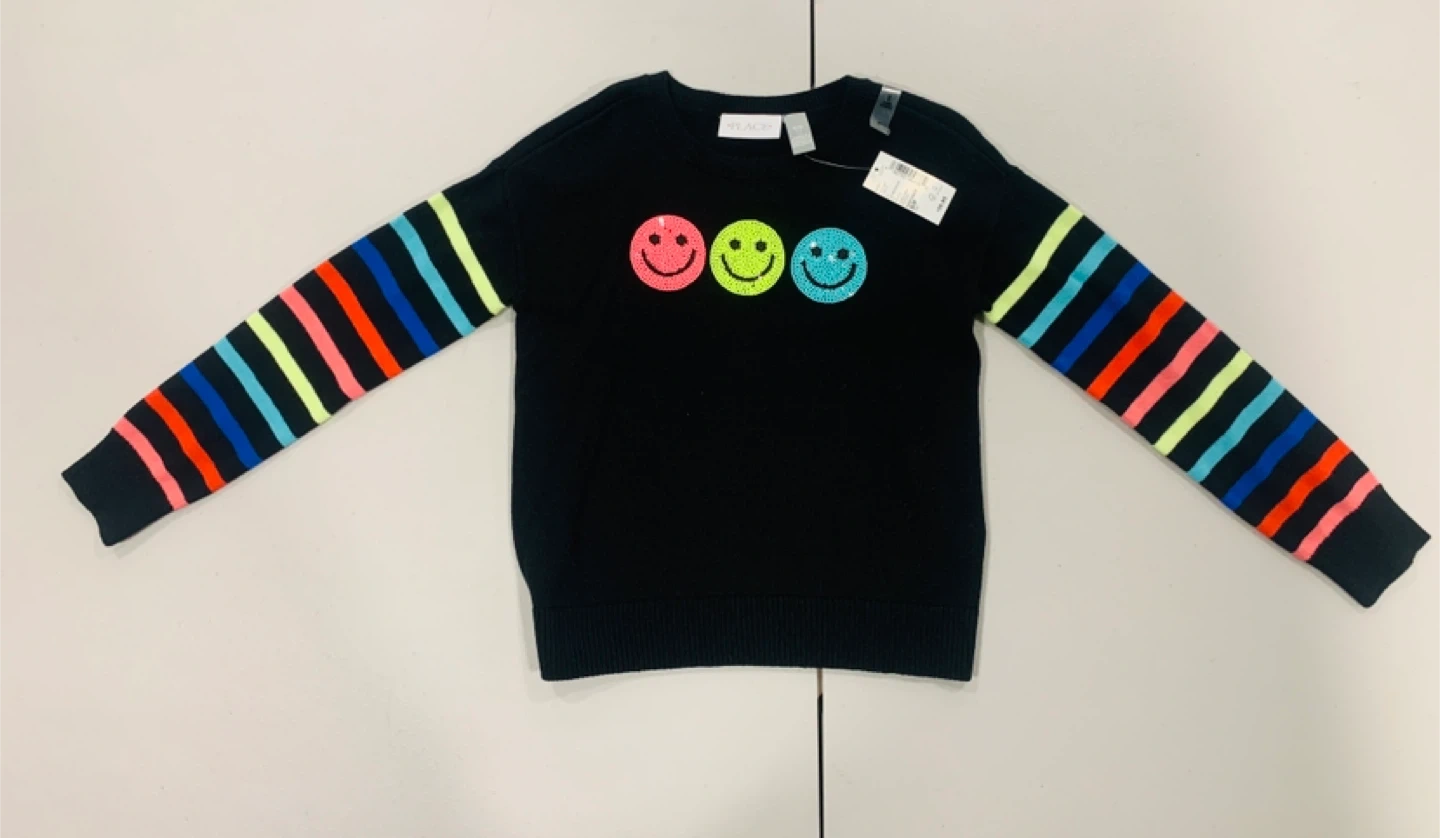 I'm selling a cute black sweater from The Children's Place! It features colorful stripes on the sleeves and three smiley faces on the front. Perfect for adding a pop of fun to any outfit!