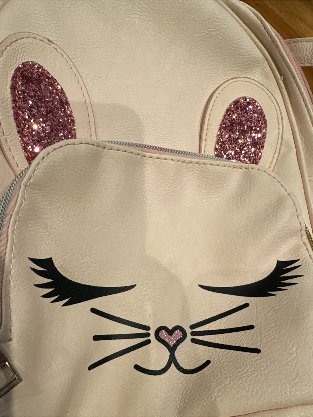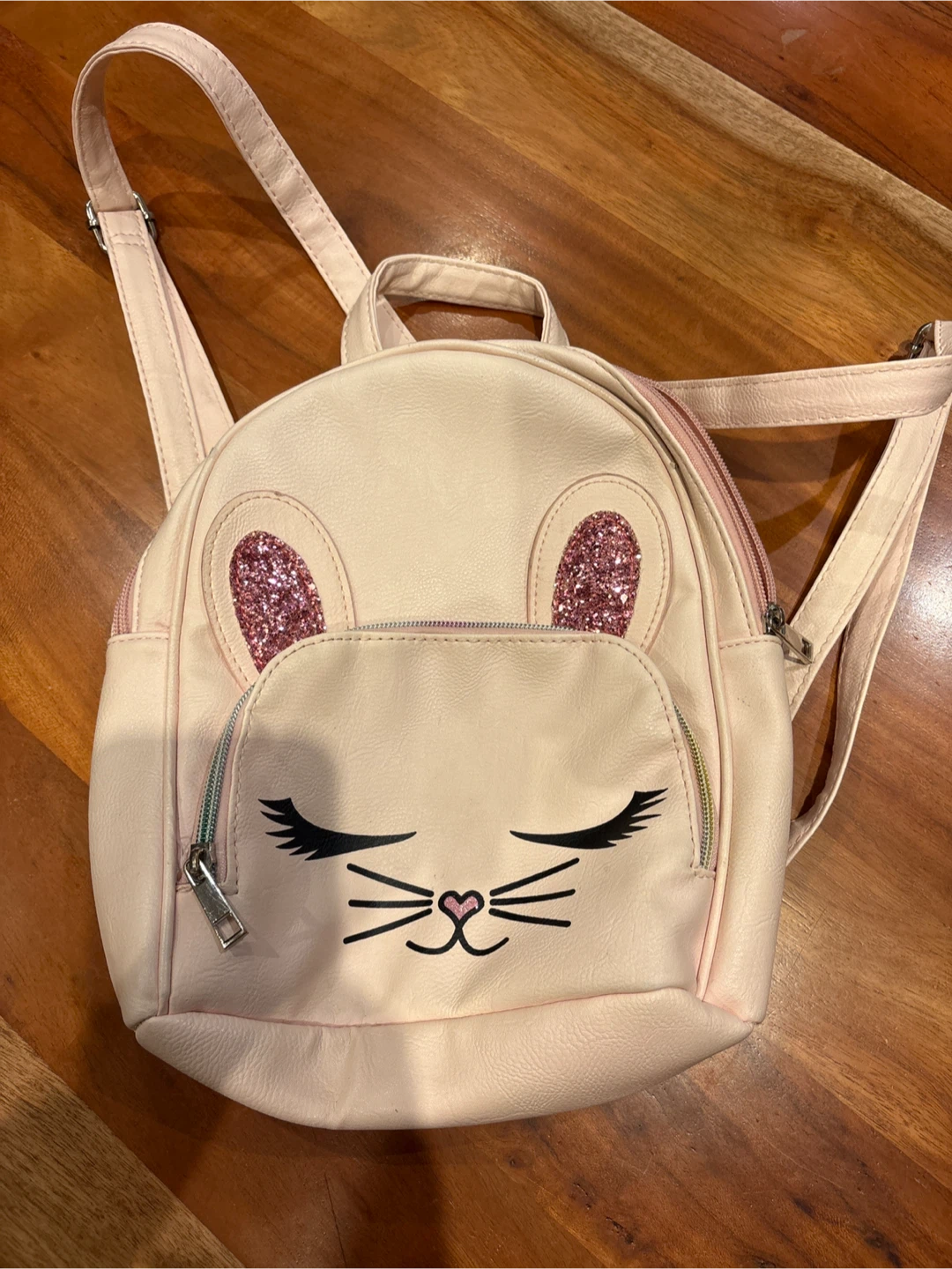 This adorable kids' backpack from OMG Accessories is in great shape! It's a light pink colour and features cute bunny details, including glittery ears and a sweet face. Made of 100% PVC.