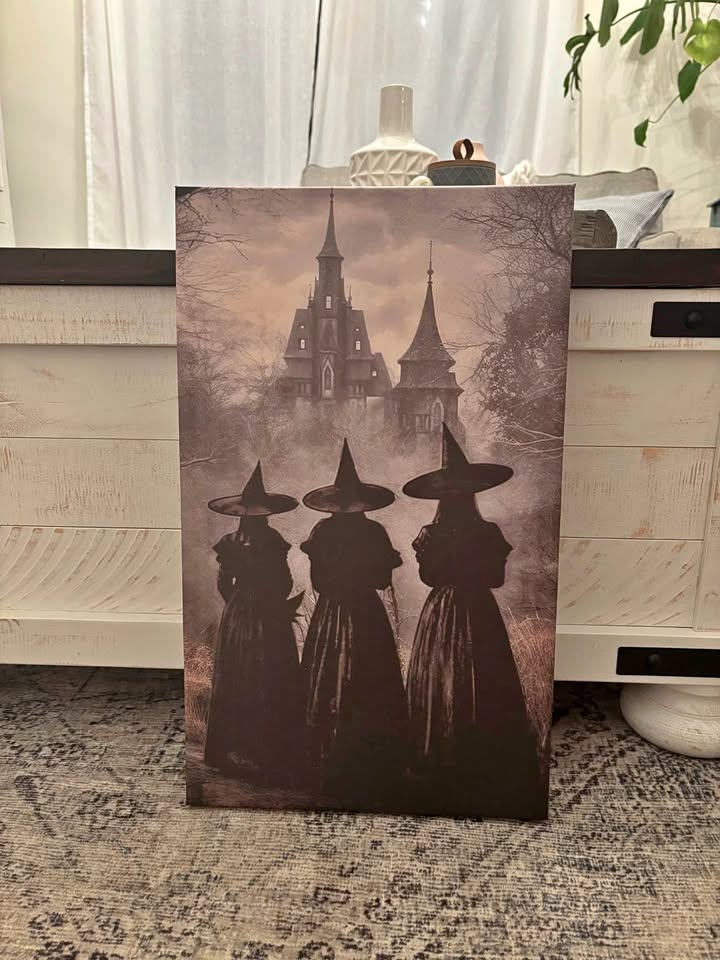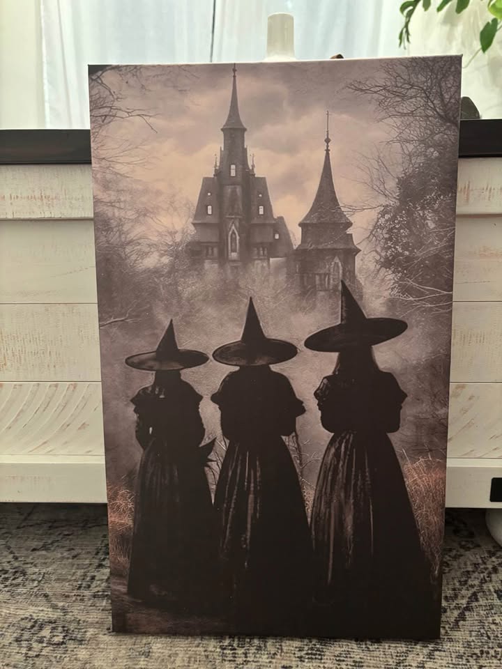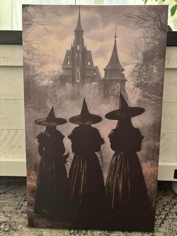 Victorian witches print on canvas. Framed onto 19.6”x11.7”x1.5” wooden frame. Light weight and ready to hang.