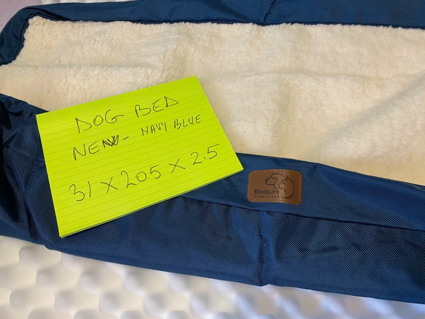 I have a brand new Bedsure Comfy Pet dog bed available! It's in navy blue and measures approximately 31 x 20.5 x 2.5 inches. Check out my other listings for more pet beds