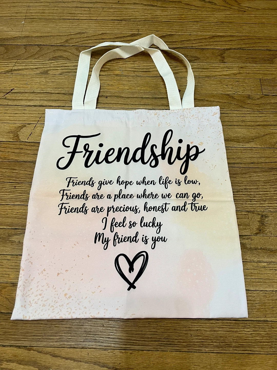 A cute tote bag with a 'Friendship' design. Back to back design. It features the words 'Friends give hope when life is low, Friends are a place where we can go, Friends are precious, honest and true. I feel so lucky, My friend is you' with a heart.