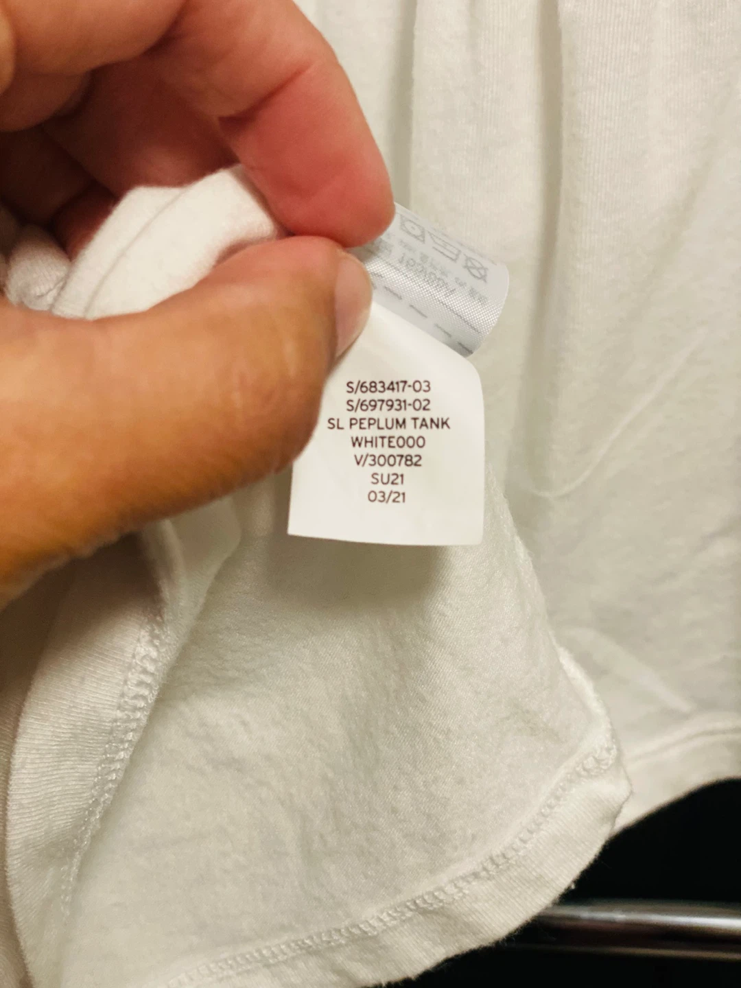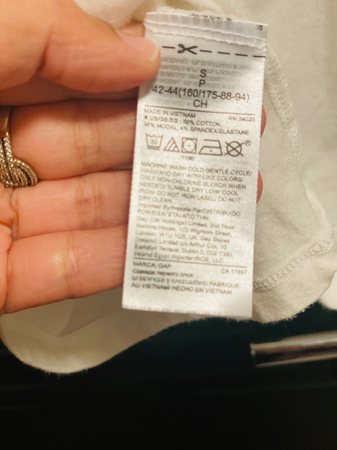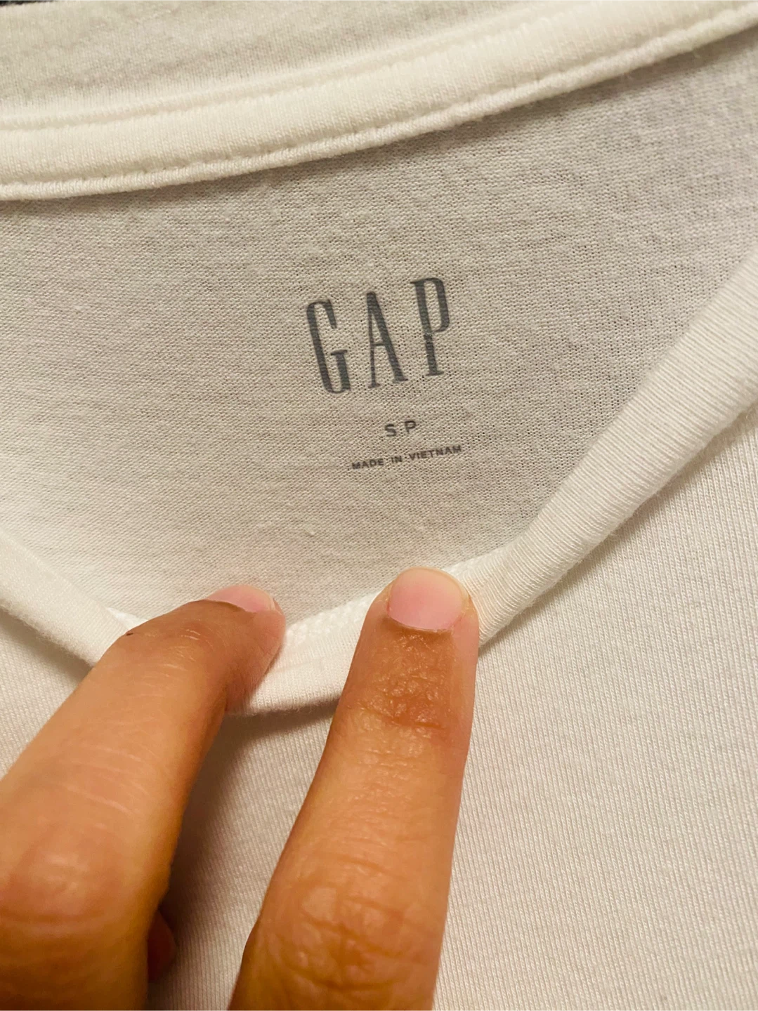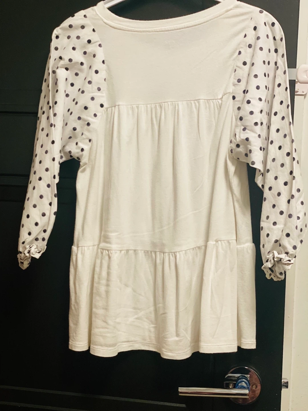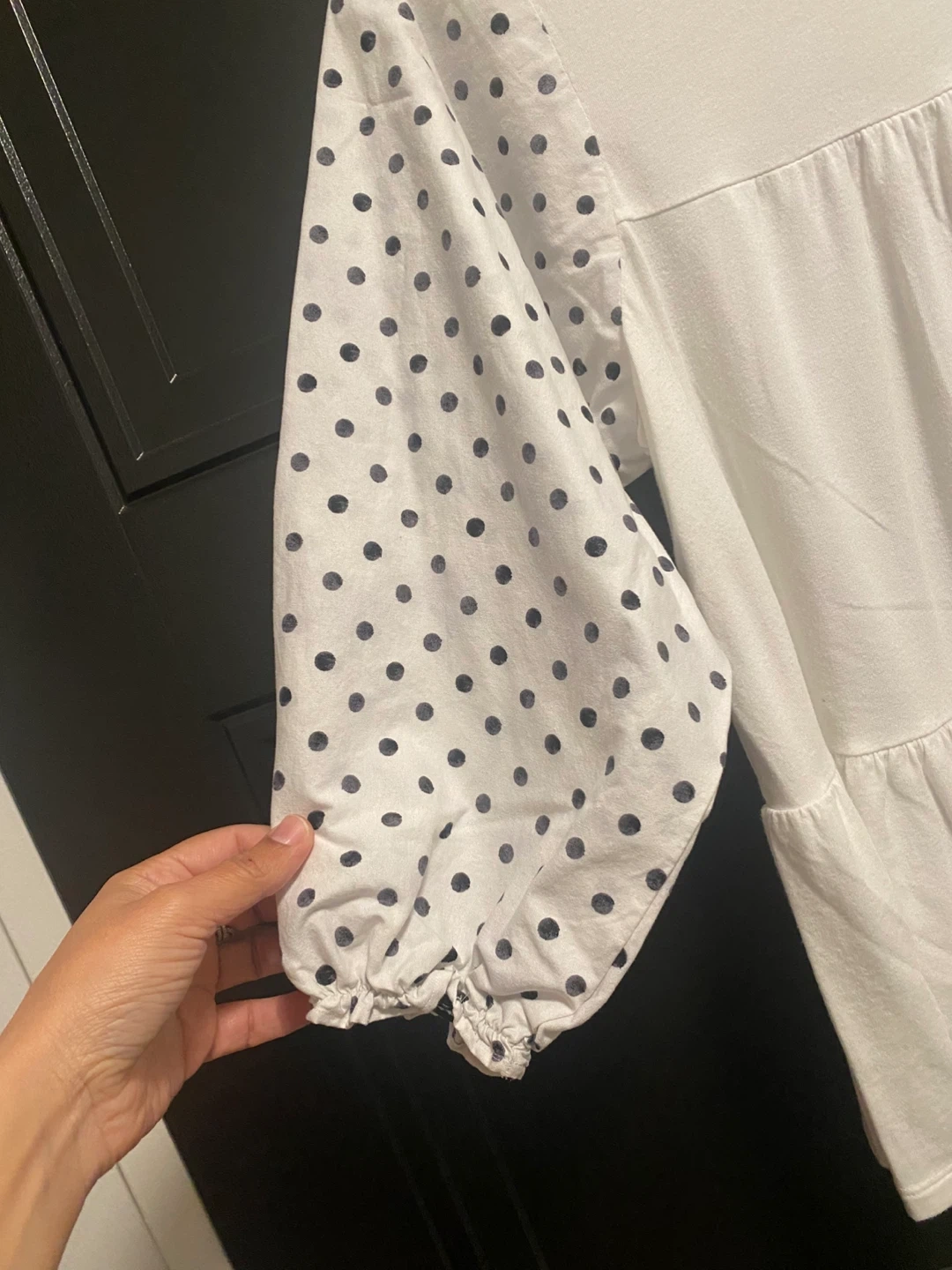 Selling a super cute GAP top! It's a white colour with fun polka dot sleeves. It's a size small and made of 62% cotton, 33% modal, and 5% spandex elastane. Perfect for a casual day out!