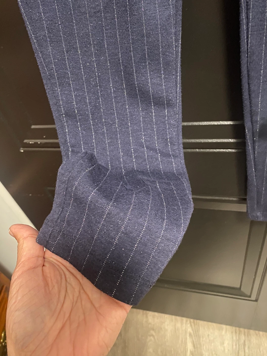 Selling a pair of navy blue semi stretchable pants with a subtle pinstripe pattern. They're in great shape and ready for a new home!