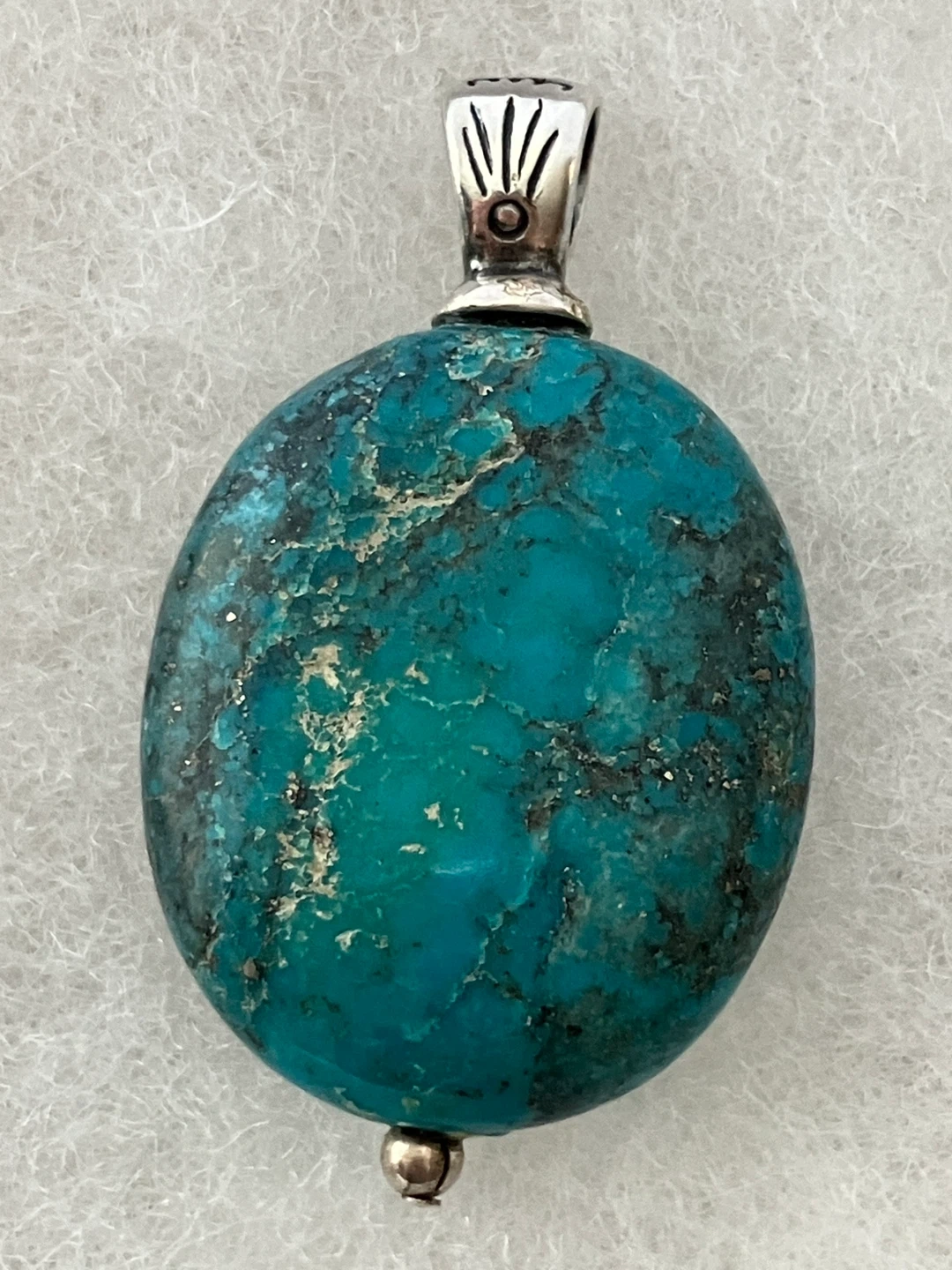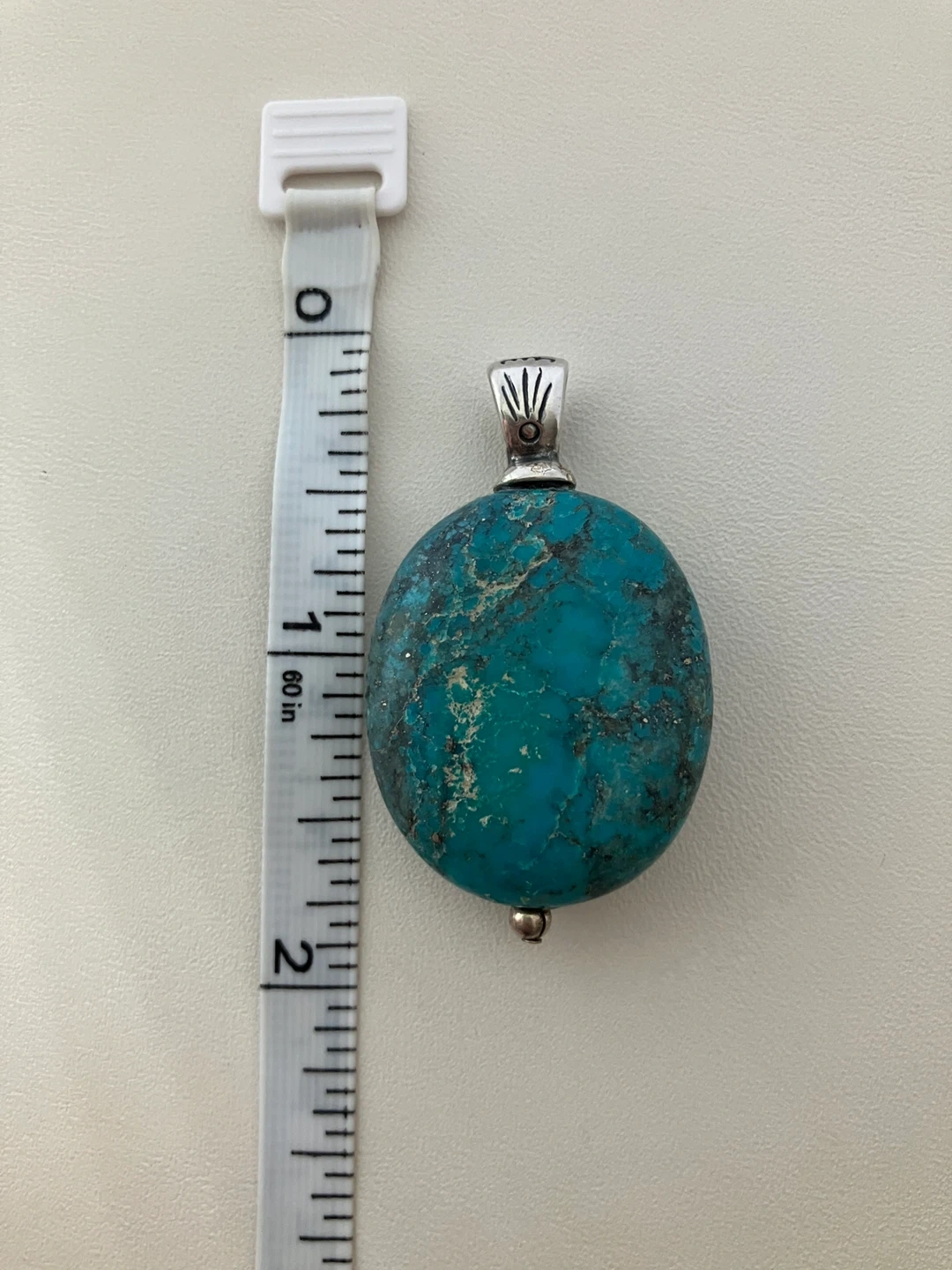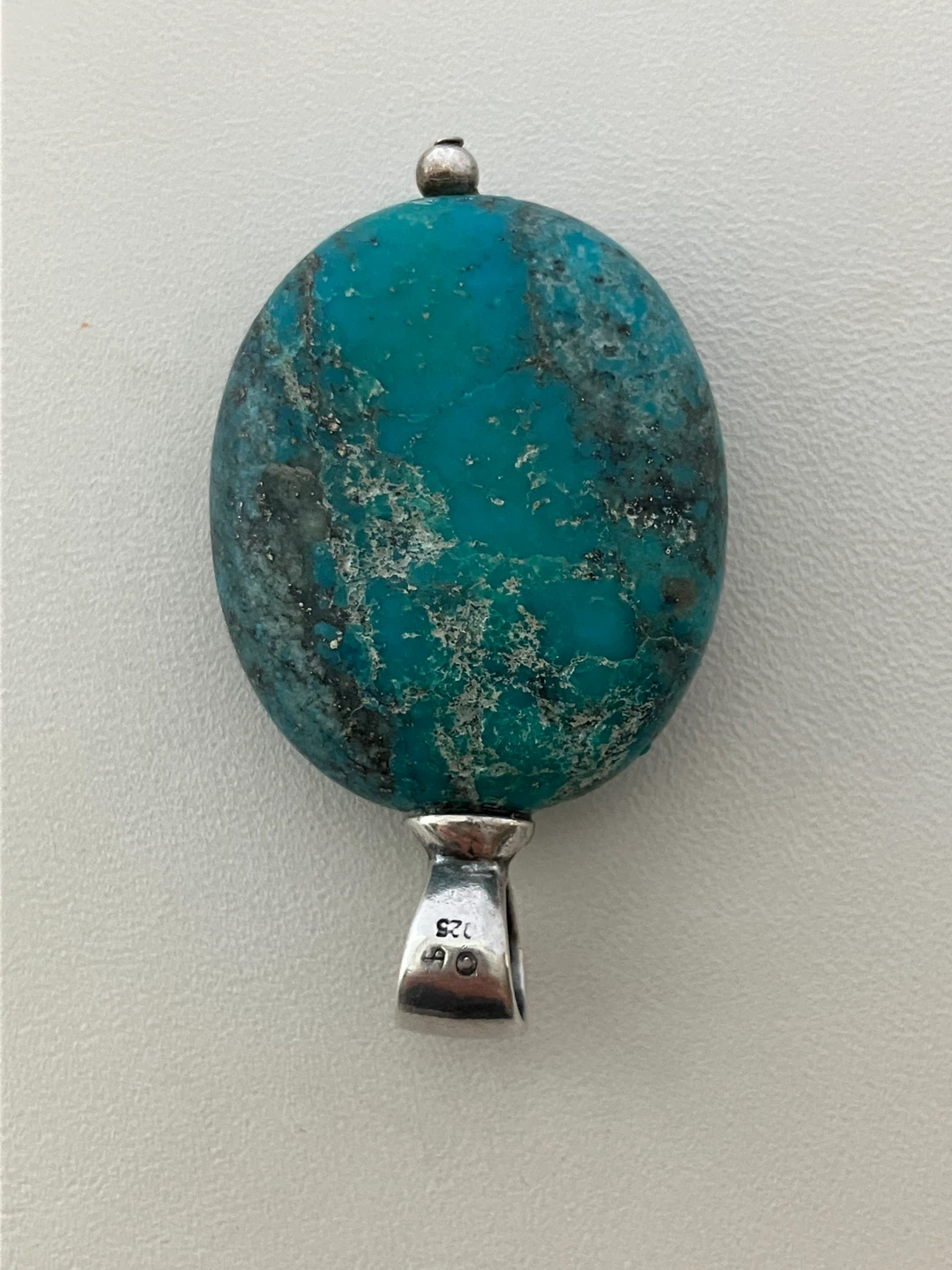 Beautiful turquoise stone pendant with a sterling silver setting. The stone is oval-shaped and measures approximately 1.75 inches in length. It's in great condition and comes in a box for safekeeping