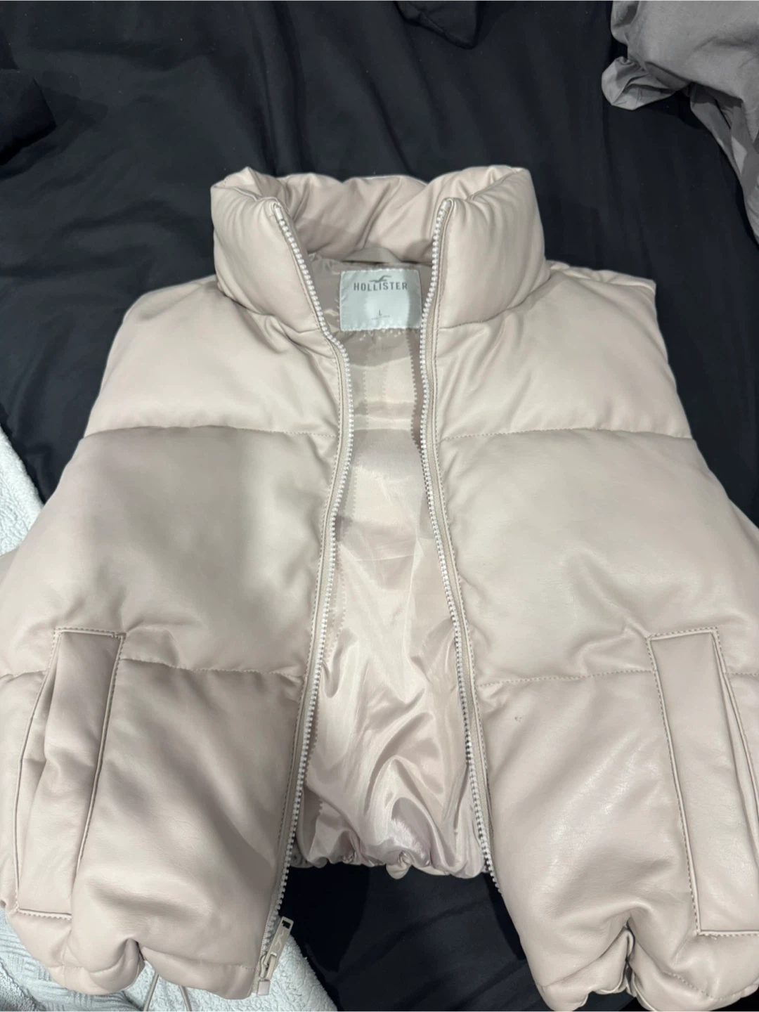 Selling a Hollister puffer vest in a neutral colour. It's a size large and in great condition! Perfect for layering during the cooler months. It's a stylish and cozy piece for your wardrobe.