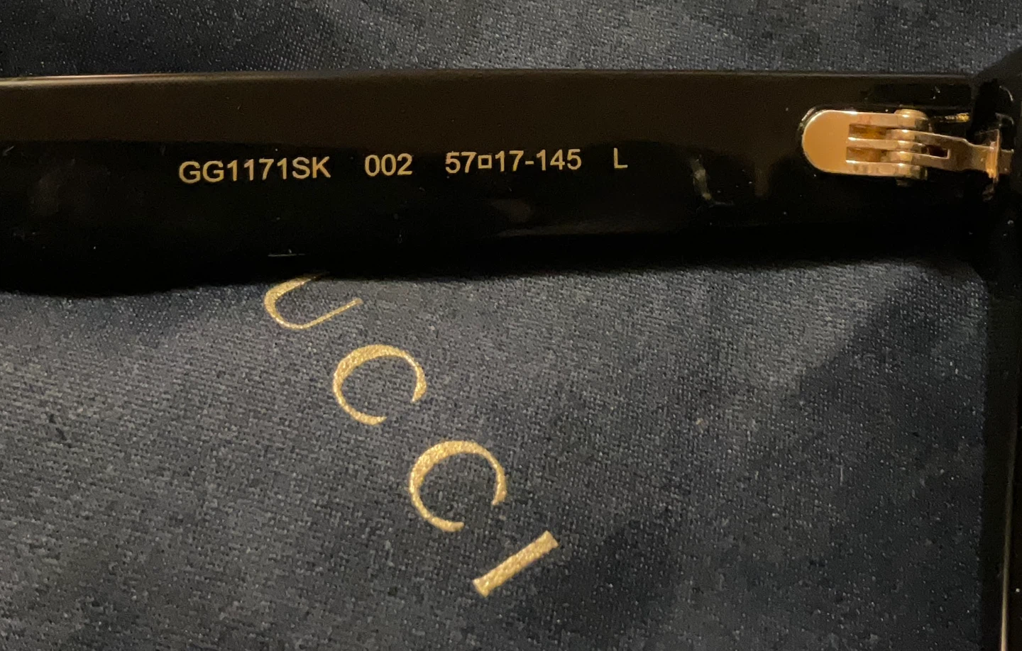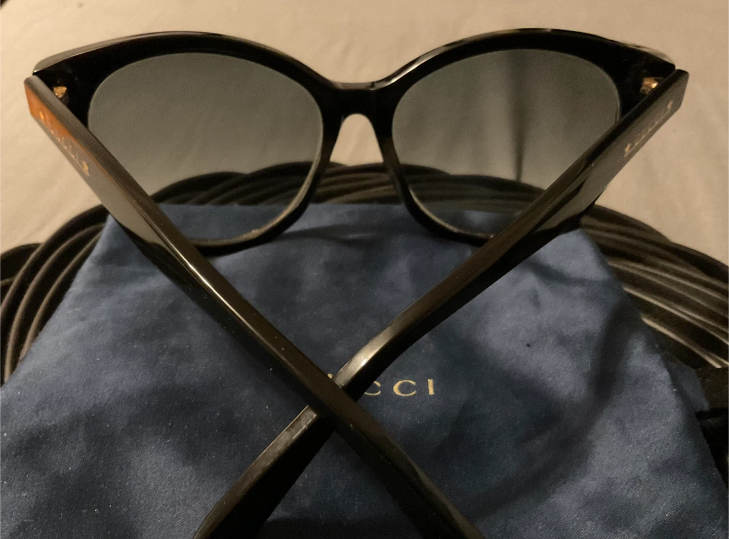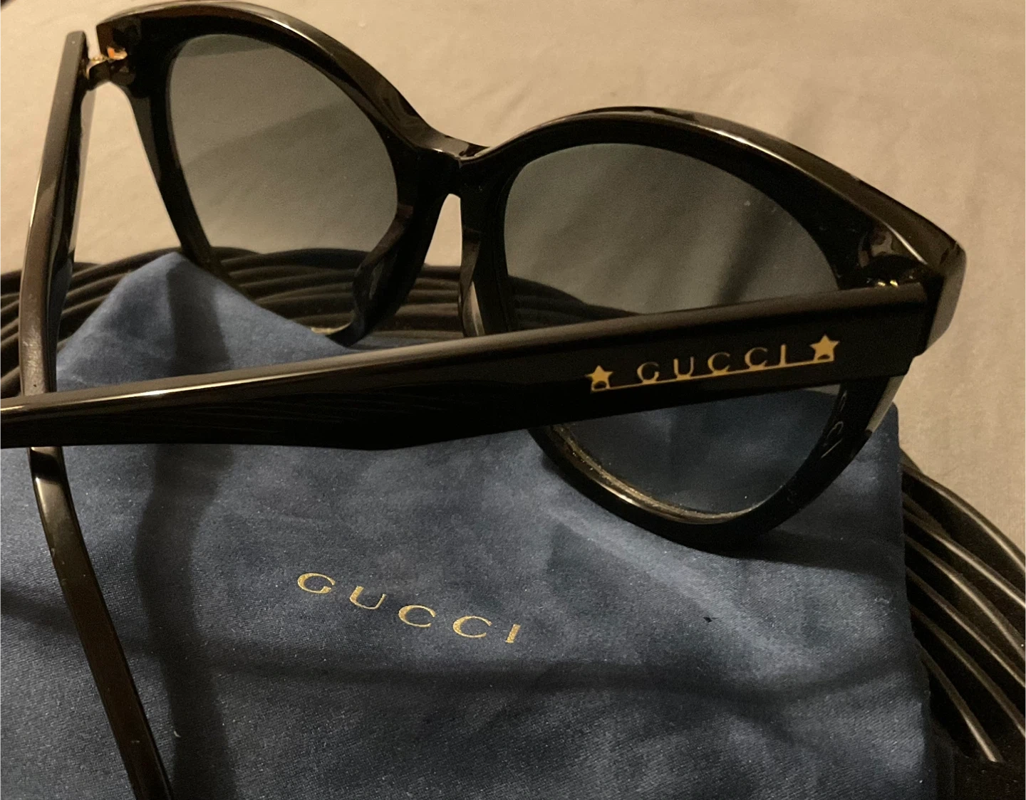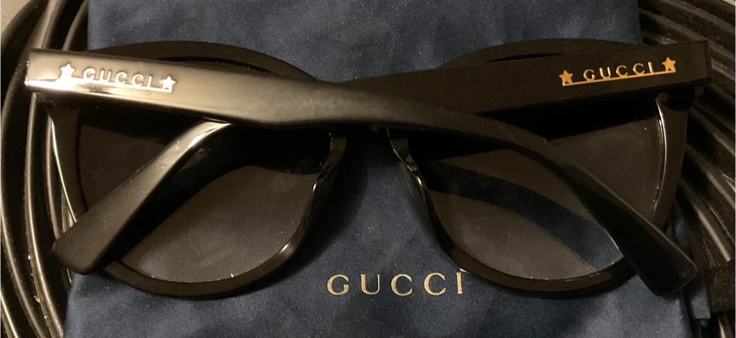 square Gucci sunglass comes in a shiny black frame with grey gradient lenses