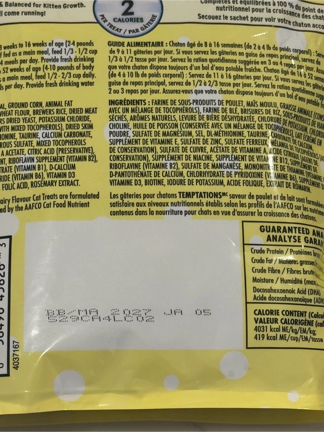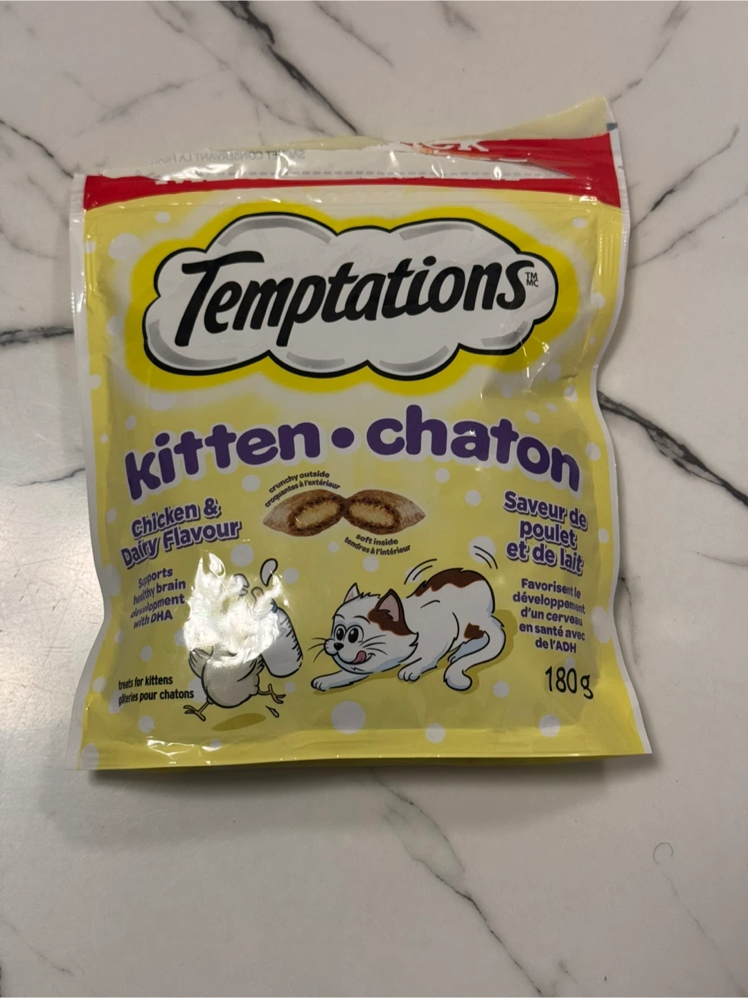 Giving away a bag of Temptations Kitten treats, chicken and dairy flavour! These are treats for kittens, supporting healthy brain development with DHA. The bag contains 180g of treats, perfect for your little one.