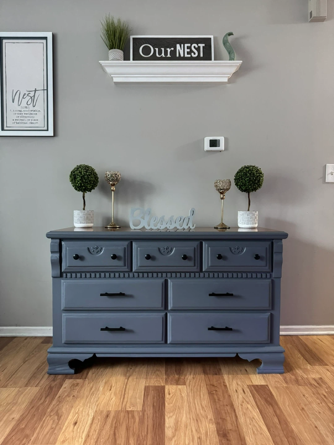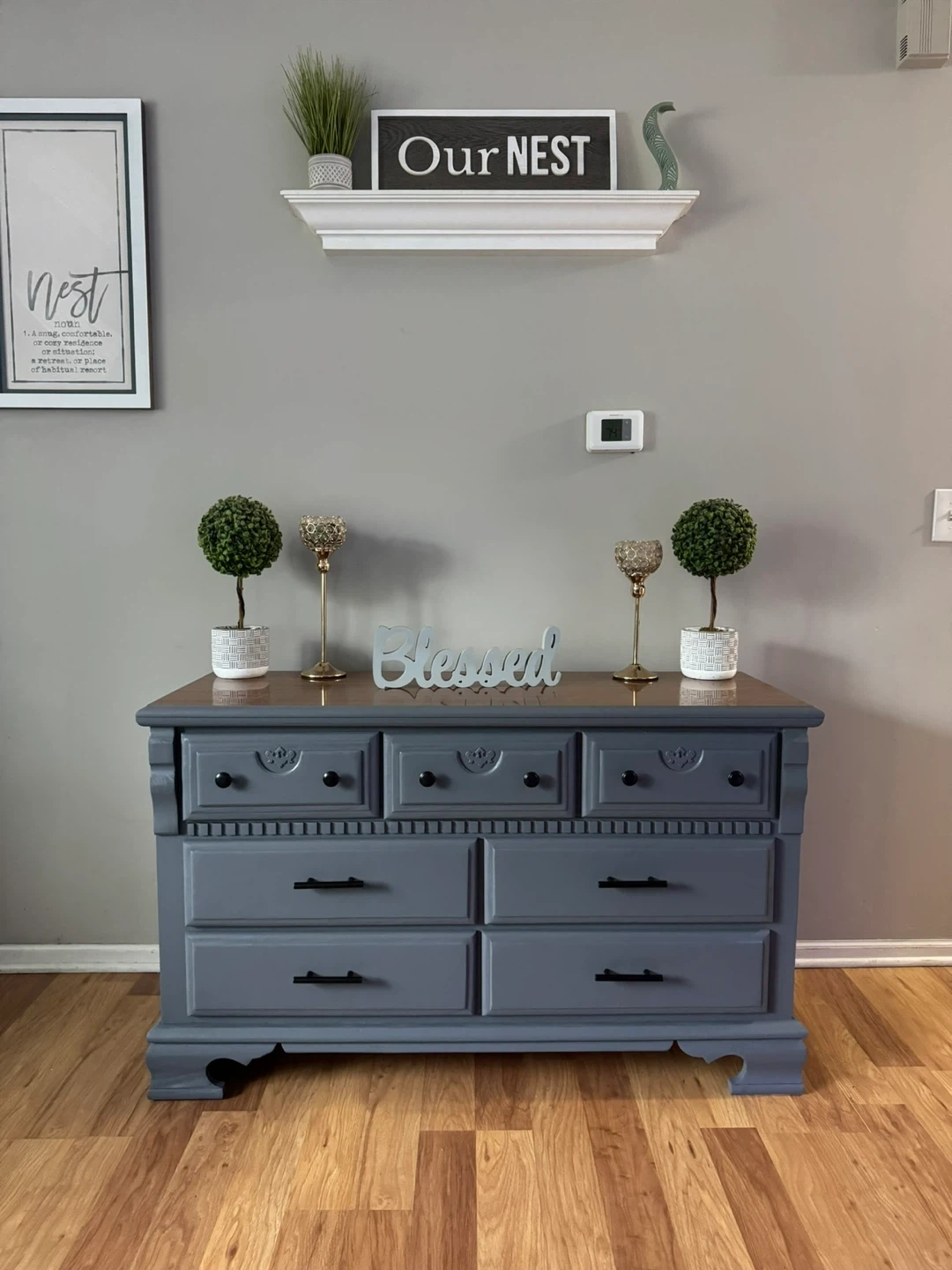 ✨Beautiful gray (can look bluish in bright light) solid refinished dresser, Bassinet furniture💪🏼, all 7 drawers pull out fine on tracks, black hardware, Original brown topping😍 solid piece💪🏼, Clean & sturdy! This is NOT that cheap wayfair/Ikea furniture, this will last you FOREVERR, I sell good quality furniture & my prices are still better/cheaper than a furniture store. Please don’t ask to lower my price‼️