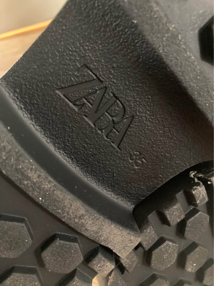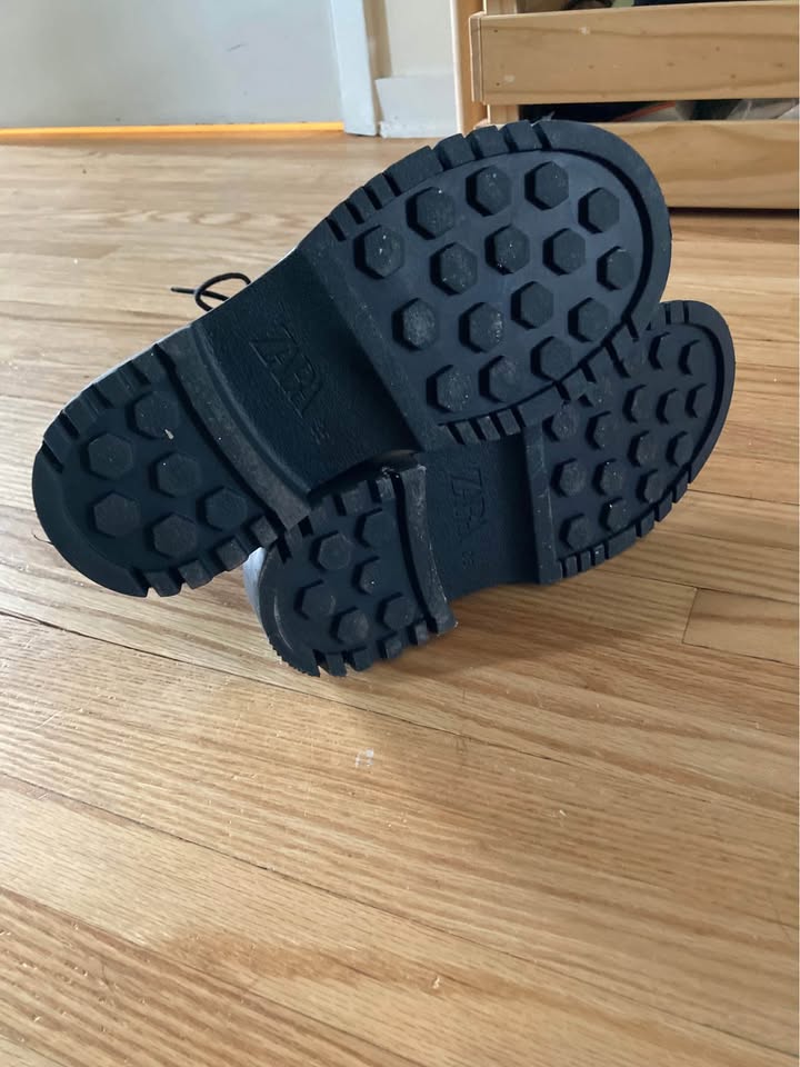 In great used condition. I wish these still fit!! These boots were the cutest. My daughter loved these ones especially but unfortunately kids feet grow fast. Bought from Zara. Size 35. They have a nice thicker sole so can be worn carefully in winter. There is a zipper on the insides of both boots so no need to untie and retie the boots each time
