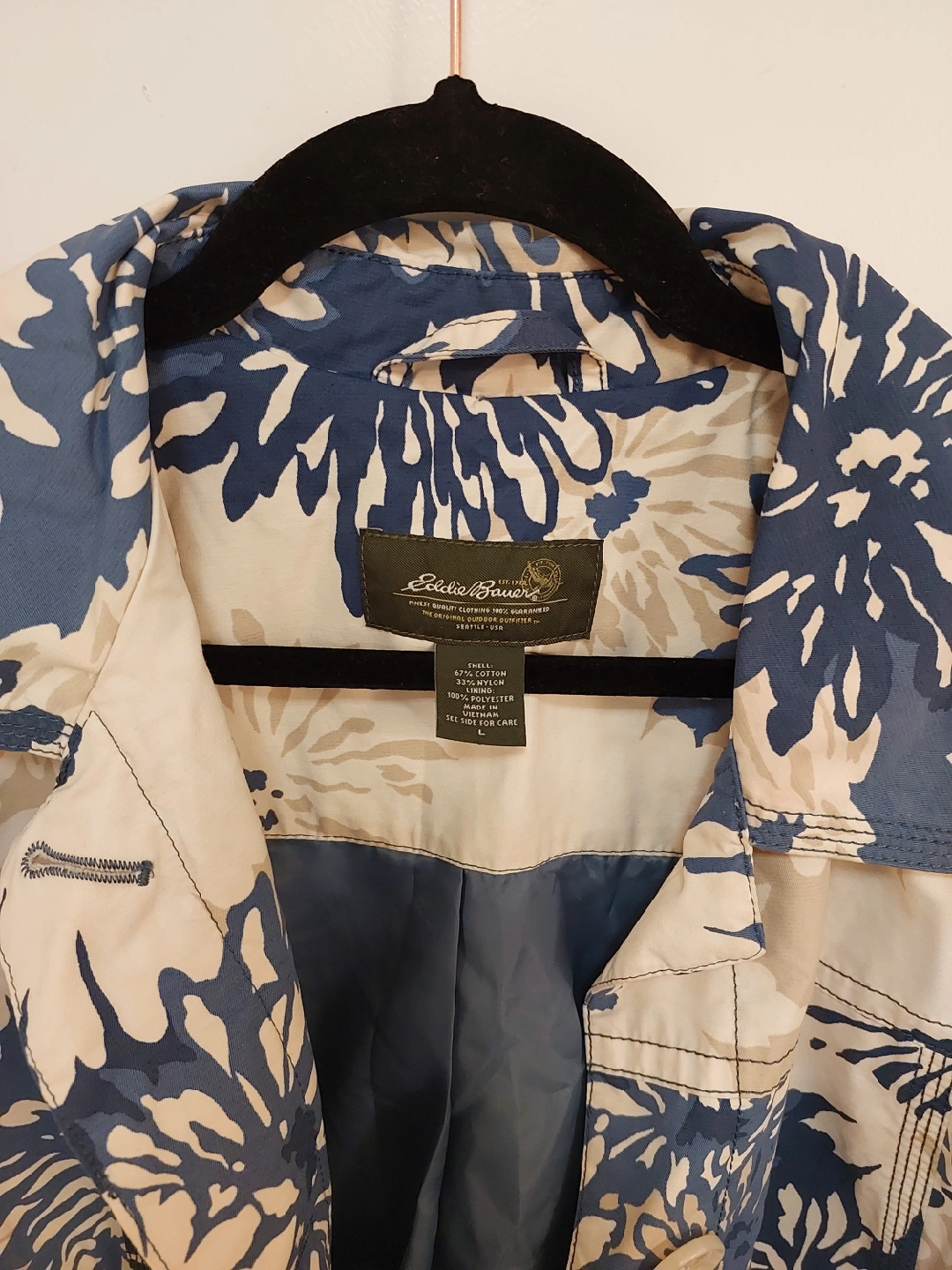 Selling a lovely Eddie Bauer jacket with a unique floral pattern! The jacket is a size L and made of 67% cotton and 33% polyester. It's in great condition and perfect for spring or fall weather