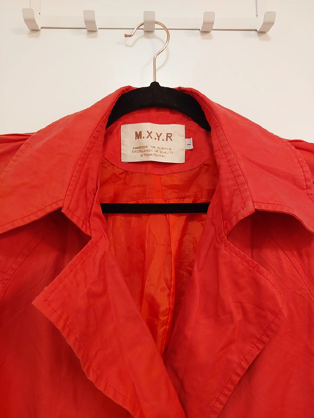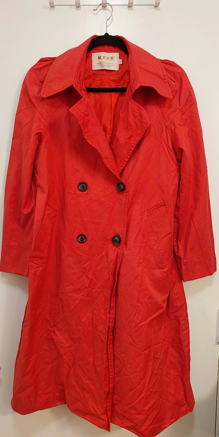 Selling a vibrant red trench coat from M.X.Y.R in size M. It's in great condition and ready for a new home! The coat features a classic double-breasted design with a stylish collar and button detailing. Perfect for adding a pop of colour to your wardrobe!