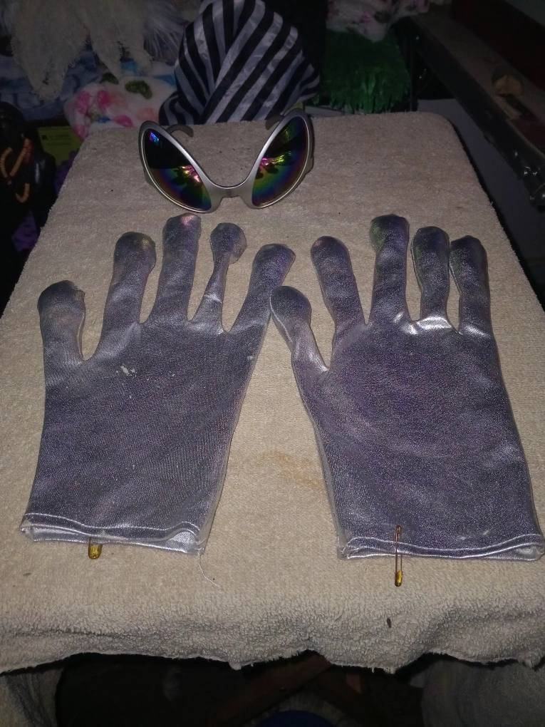 Get ready to turn heads with this fun costume set! Includes a pair of silver alien gloves and matching sunglasses. Perfect for parties, Halloween, or just adding a bit of fun to your day