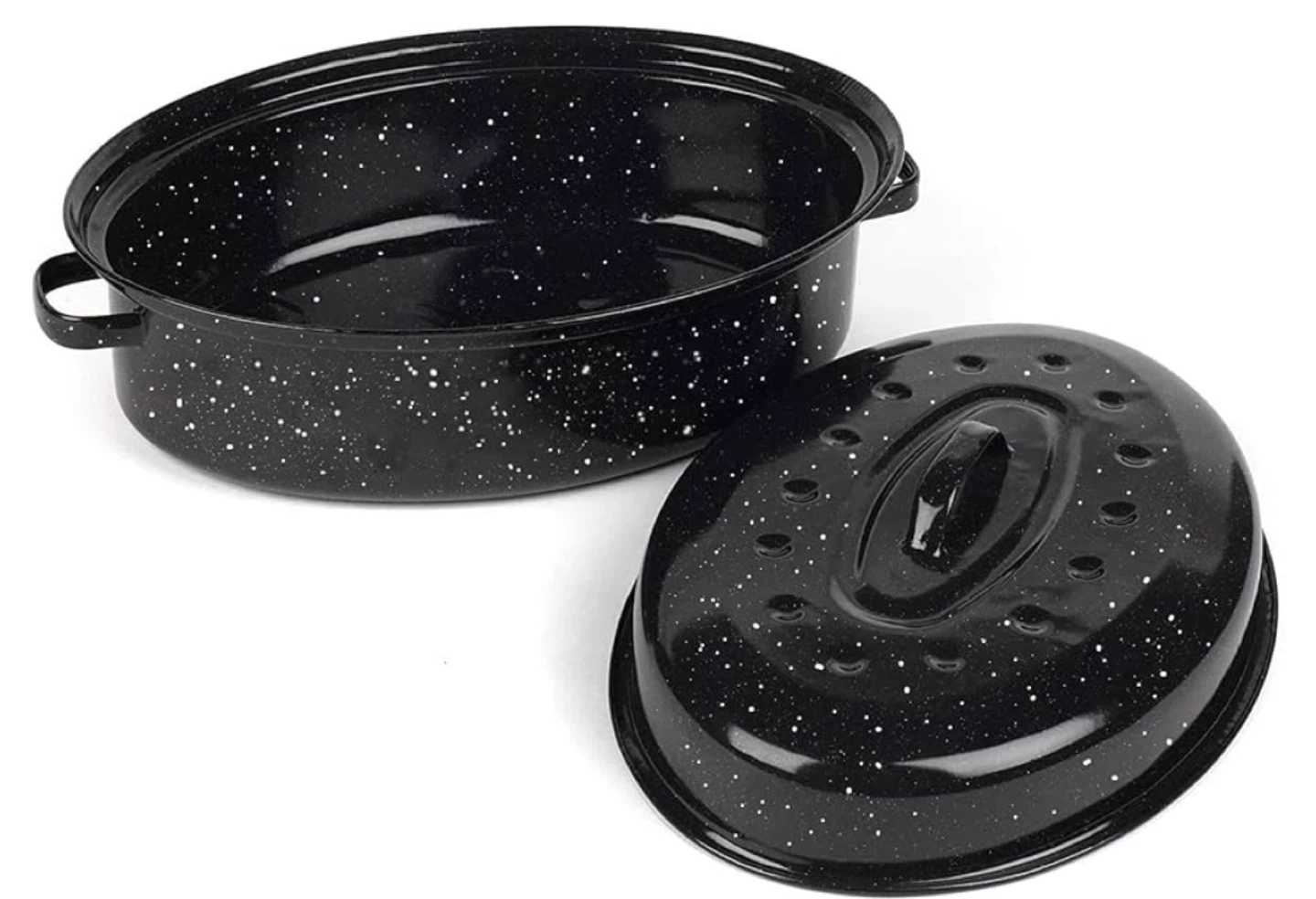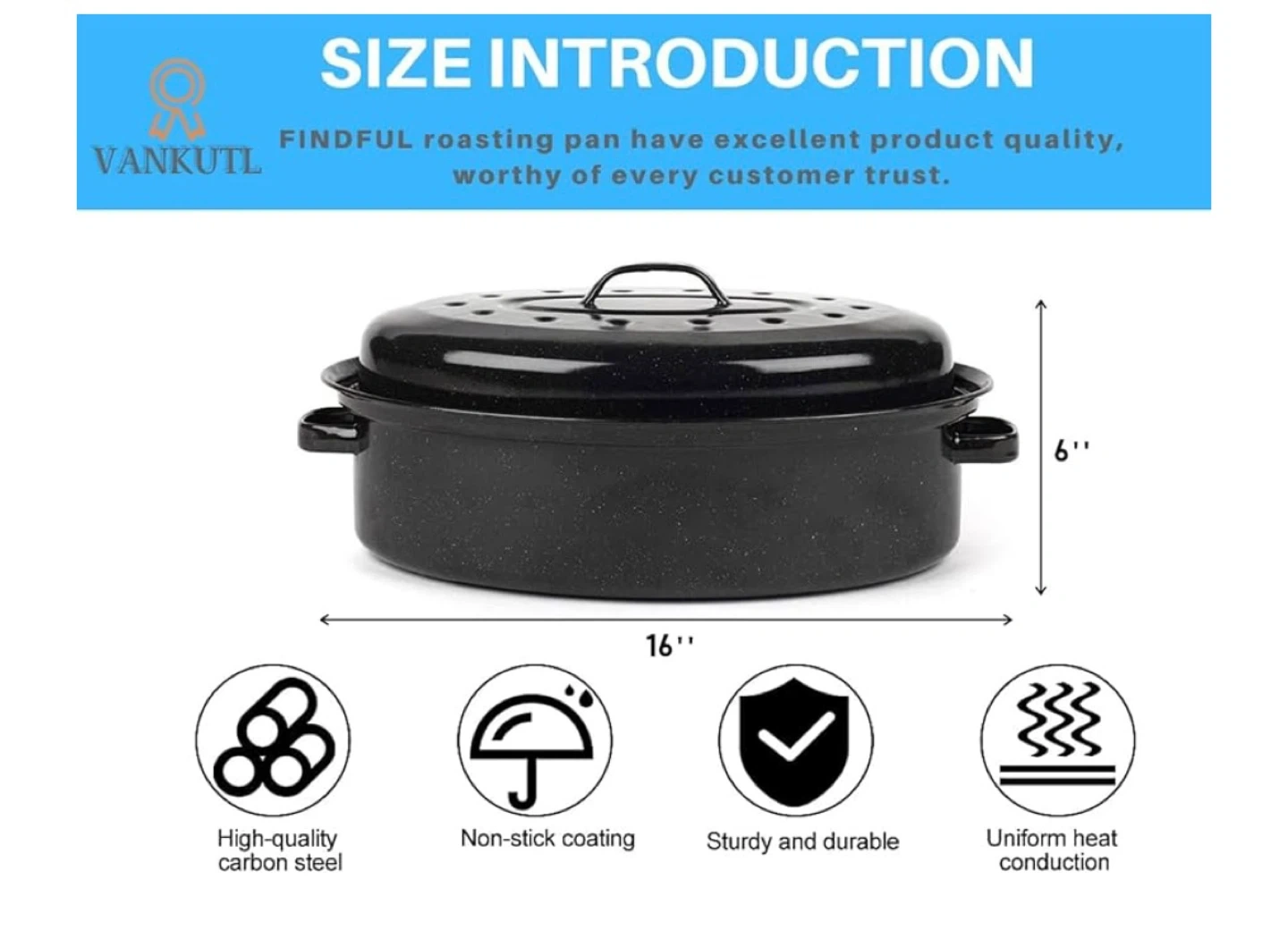 I'm selling a Vankutl roasting pan! It's 16 inches wide and 6 inches tall. It's made of high-quality carbon steel with a non-stick coating. It's sturdy, durable, and provides uniform heat conduction.