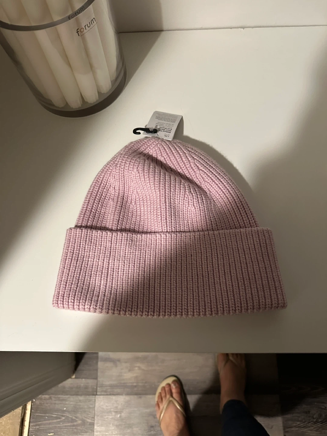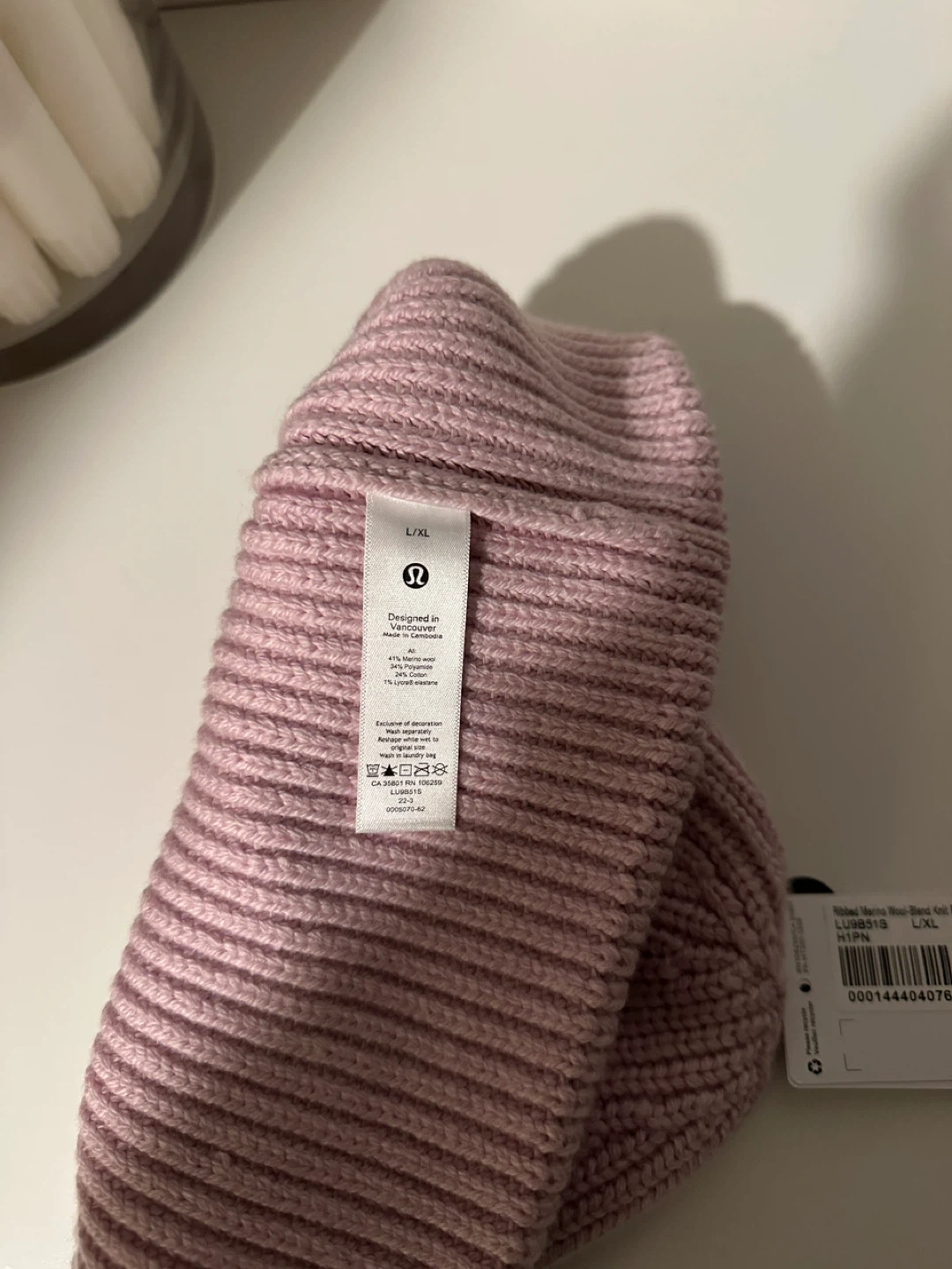 Selling a Lululemon Ribbed Wool-Blend Knit Beanie in size L/XL! It's a beautiful light purple colour. The beanie is made of 45% merino wool, 45% recycled polyester, and 10% lycra elastane. The tag shows it was originally $54