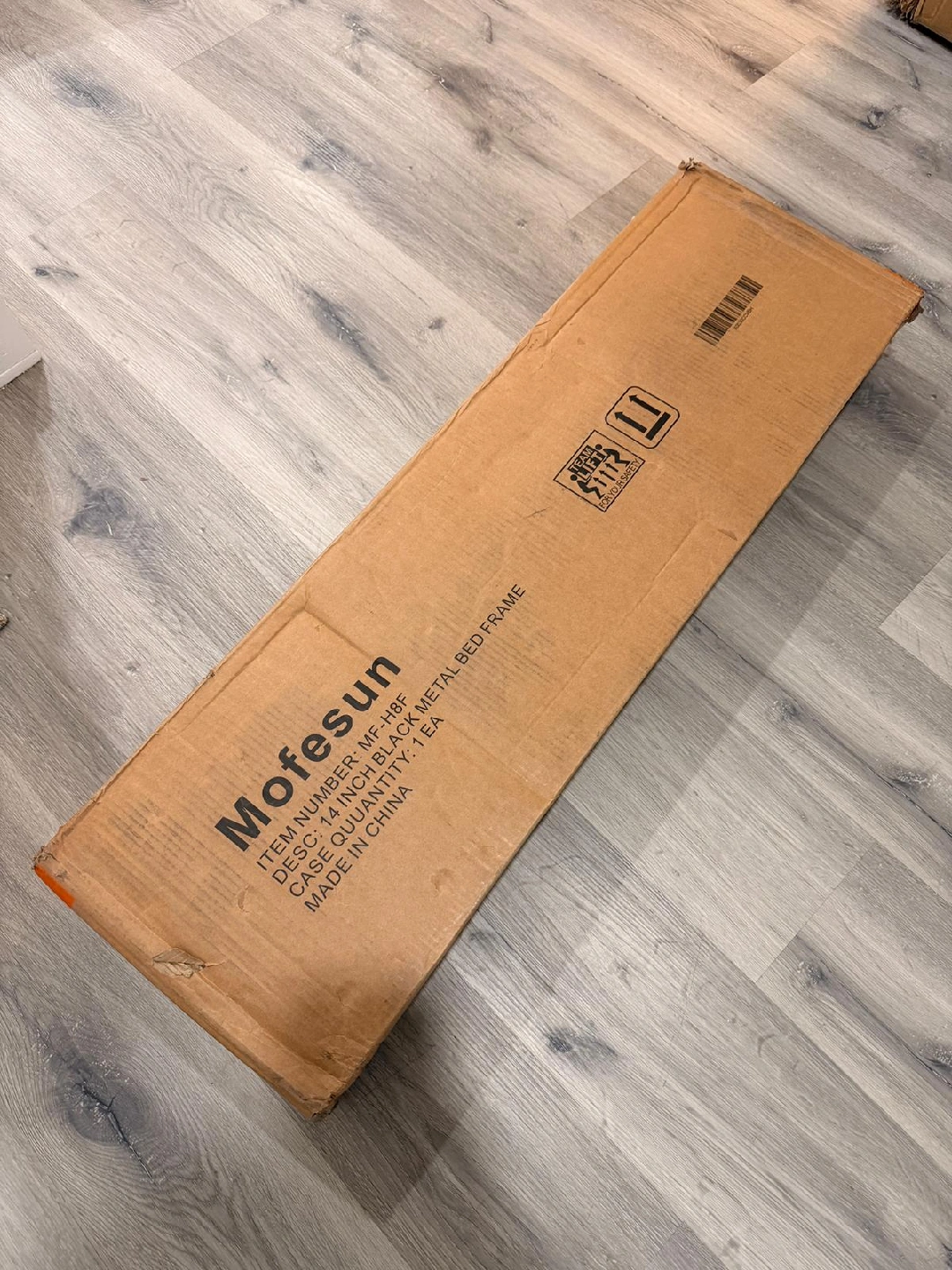 Selling a Mofesun metal bed frame in full size. It's a black metal platform bed, 14 inches high, with storage space underneath. Easy to assemble and no box spring is needed!
