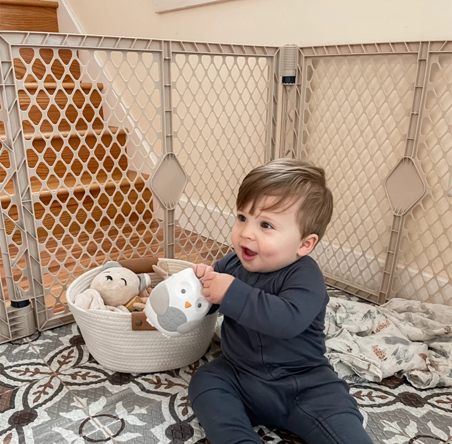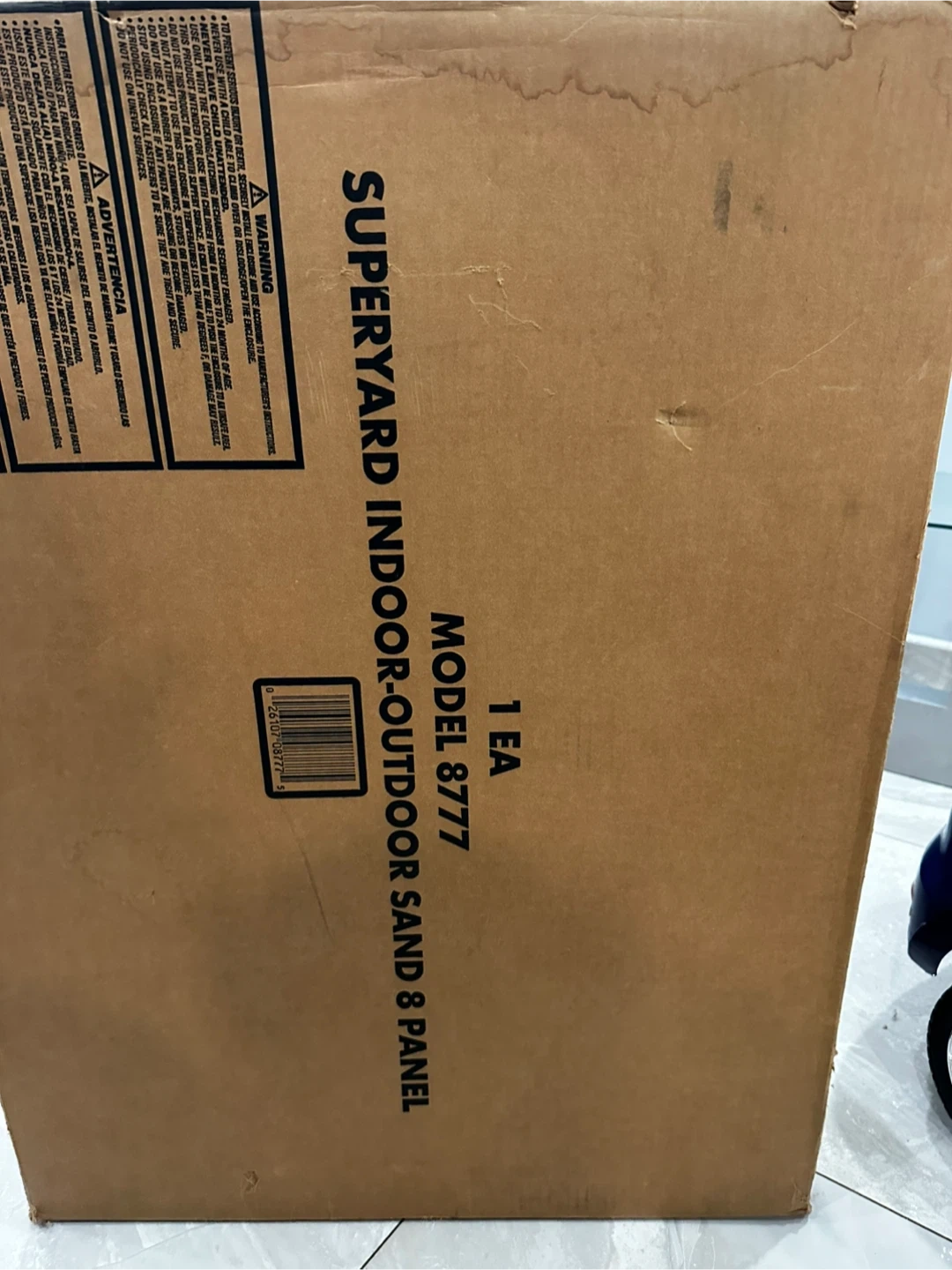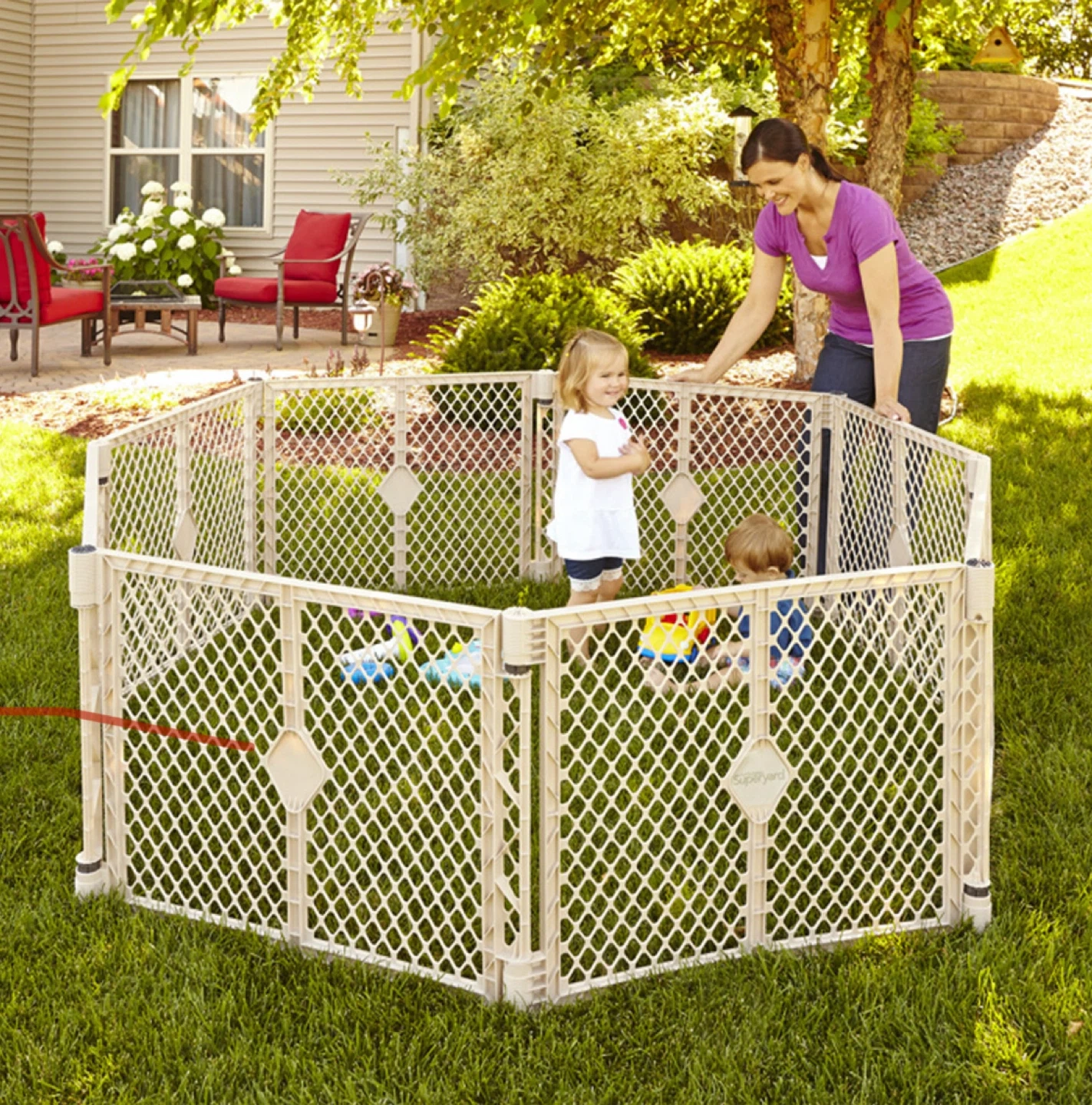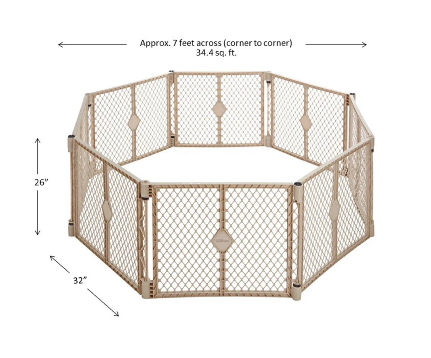 Selling a Superyard Indoor/Outdoor 8-panel playard in sand color. It's in great shape and ready for a new home! This playard is versatile and can be used both indoors and outdoors, providing a safe and fun space for your little one. It measures approximately 7 feet across (corner to corner) and has a height of 26 inches. Each panel is 32 inches wide. The playard encloses 34.4 sq ft