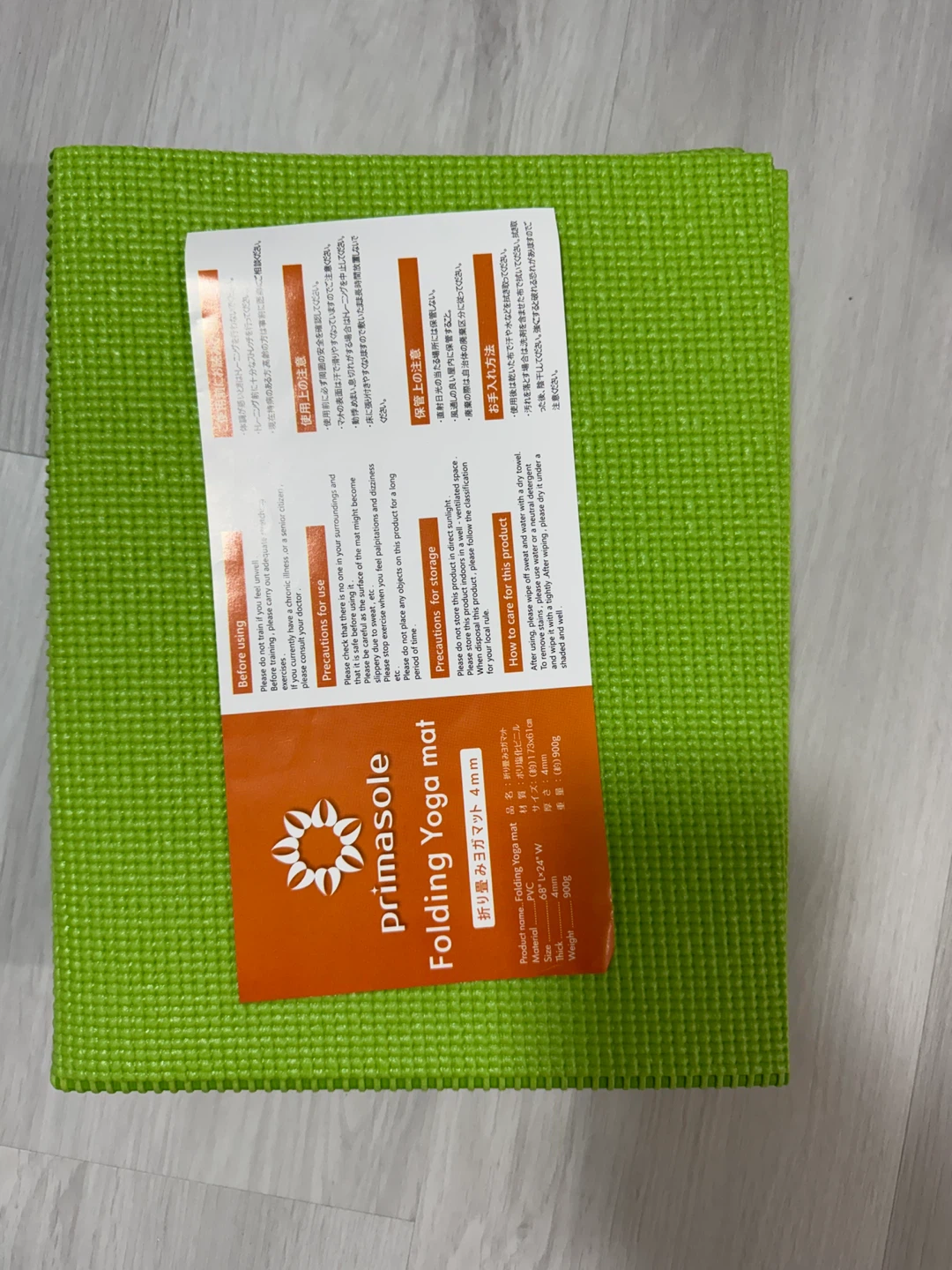 Selling a Primasole folding yoga mat in excellent condition! It's a vibrant green and measures 68" x 24". It's made of PVC and is 4mm thick, weighing only 900g, making it super easy to carry around. Perfect for your yoga sessions or workouts!
