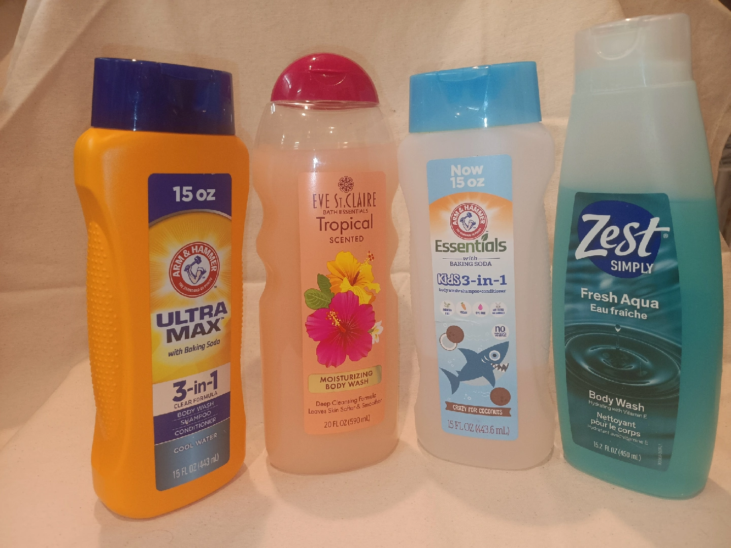761Selling a lot of body wash bottles! Includes: - Arm & Hammer Ultra Max 3-in-1 (15 oz)80% full - Arm & Hammer Essentials Kids 3-in-1 (15 oz)40% full - Zest Simply Fresh Aqua (15.2 oz)95% full - Eve St. Claire Tropical Scented Moisturizing Body Wash (20 fl oz)100% full