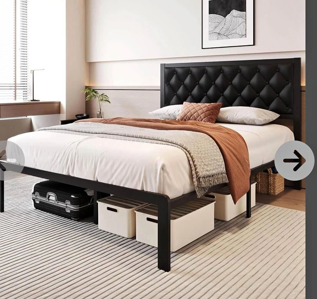 New Queen Size Metal Platform Bed Frame with Button Tufted Faux Leather Upholstered Headboard, 12.4 Inch Mattress Foundation with Storage, No Box Spring Needed, Easy Assembly, Modern Design: The diamond stitched design of the headboard, combined with the faux leather upholstery, adds a touch of elegance and sophistication to any bedroom. Full and compact sponge filling provides high elastic support, soft and comfortable. Sturdy Support: Reinforced metal slats offer excellent support for various types of mattresses, eliminating the need for a box spring and saving you money. With a maximum weight capacity of 900 lbs, it is the perfect choice for all family members. Sleep noiselessly: Designed with a silent bar, which prevents metal slats from wearing down and reduces the noise caused by friction. You won't hear any squeaking or creaking when you get in or out of bed, ensuring a restful sleep. Storage Space: Provides 12.4 inches of clearance under the bed, offering ample room for storage. This is ideal for those who have limited space in their bedrooms or need additional storage, keeping the room clean and clutter-free. New Queen Size Metal Platform Bed Frame with Button Tufted Faux Leather Upholstered Headboard, 12.4 Inch Mattress Foundation with Storage, No Box Spring Needed, Easy Assembly, Product Dimensions: 64.17 x 18.5 x 3.54 inch