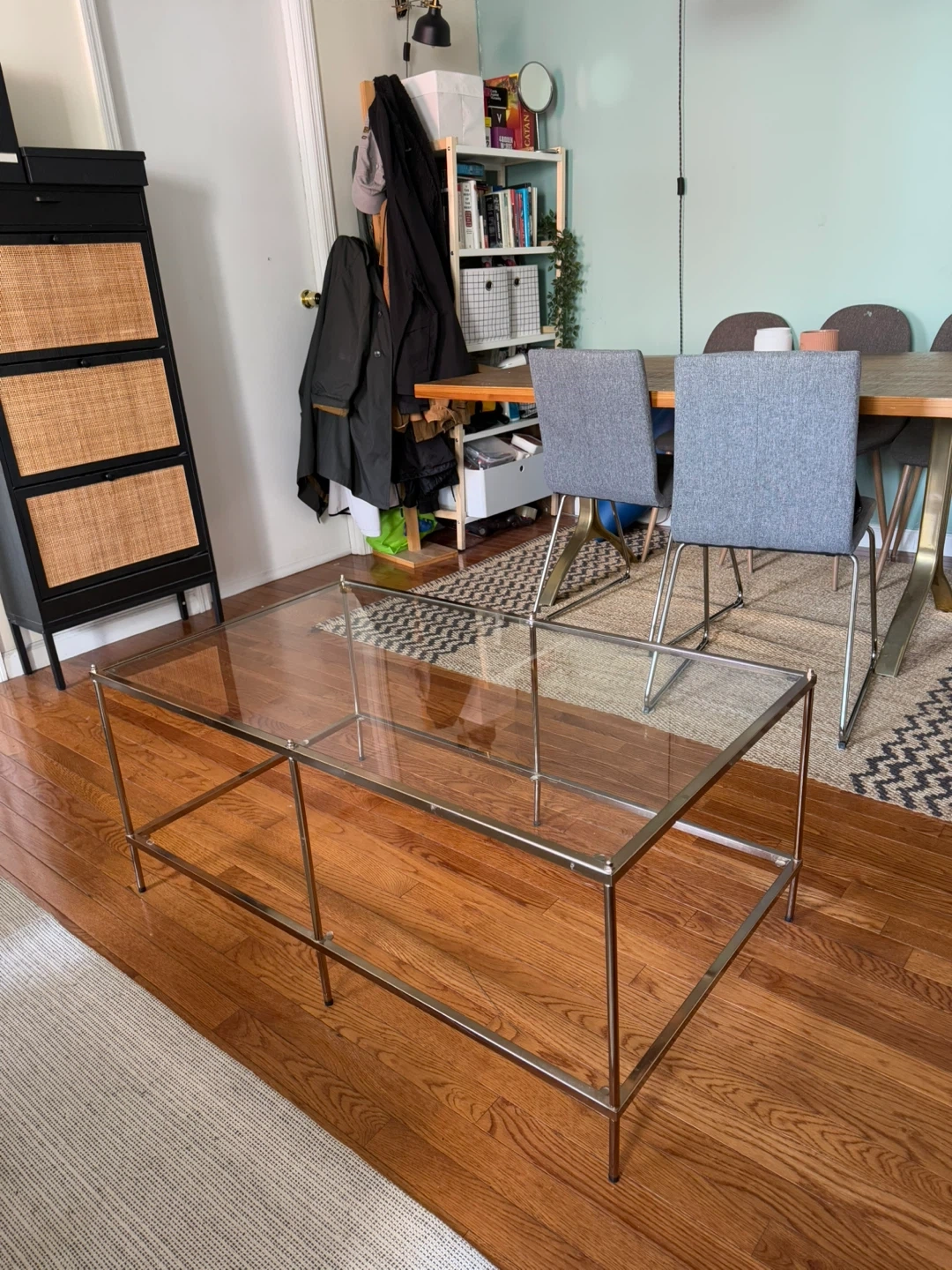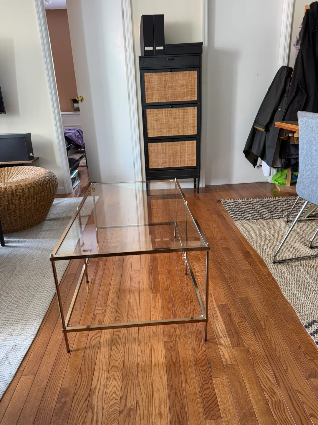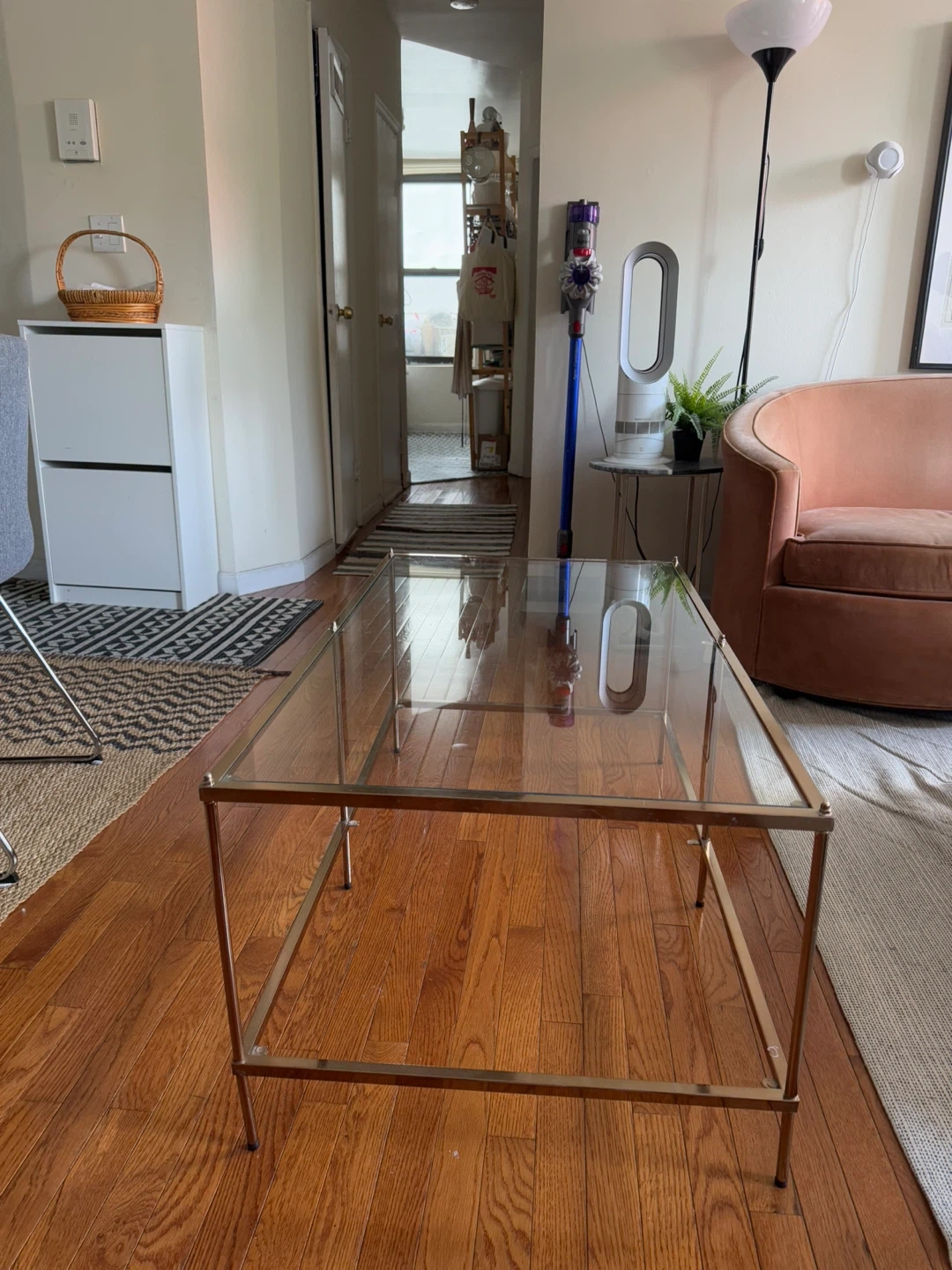 Selling a stylish coffee table with a gold frame and glass top. It's in great condition and would look lovely in any living room!