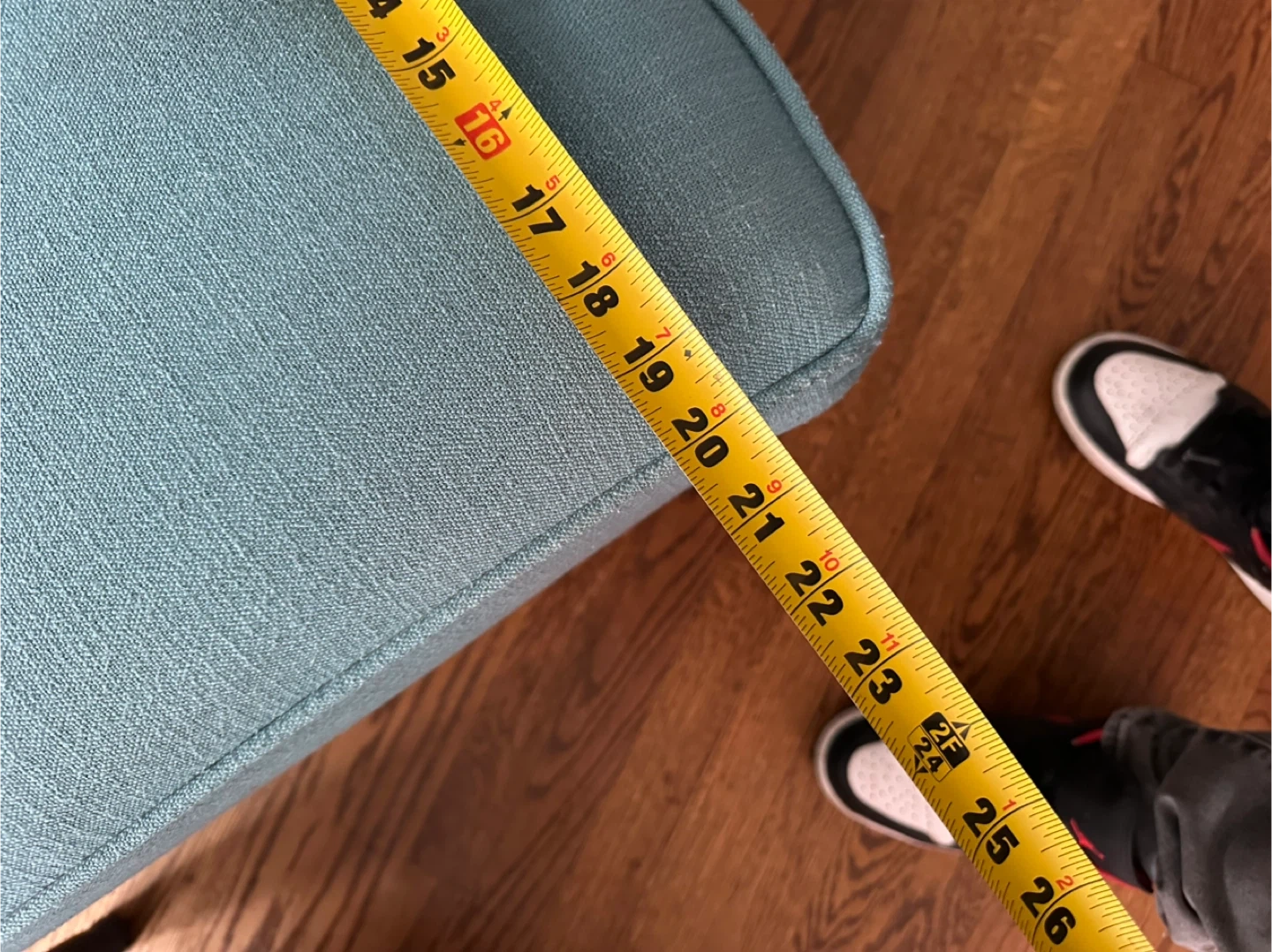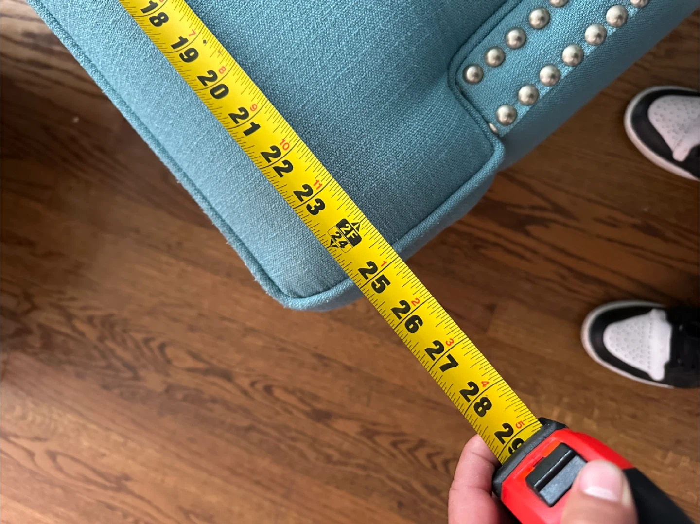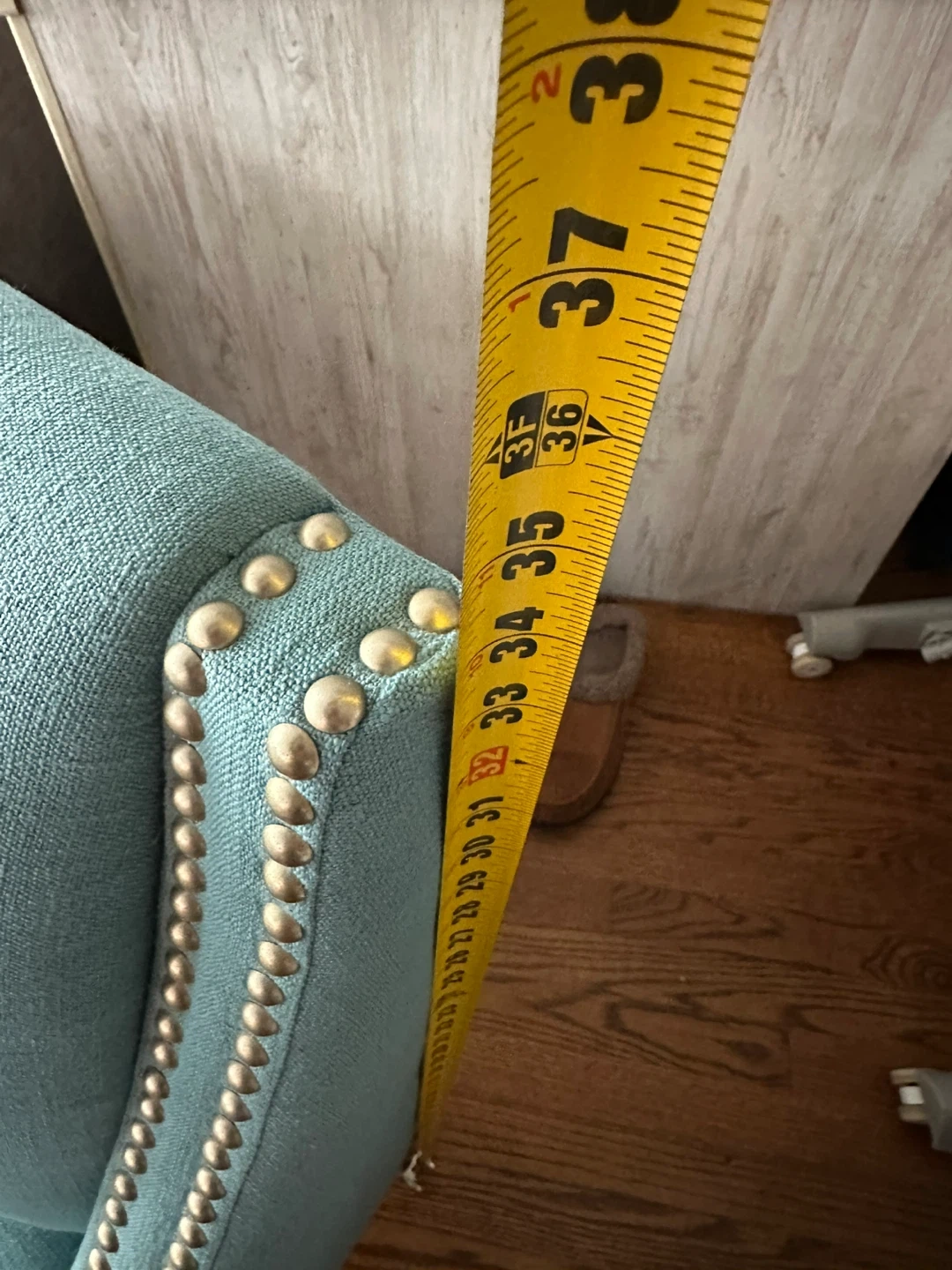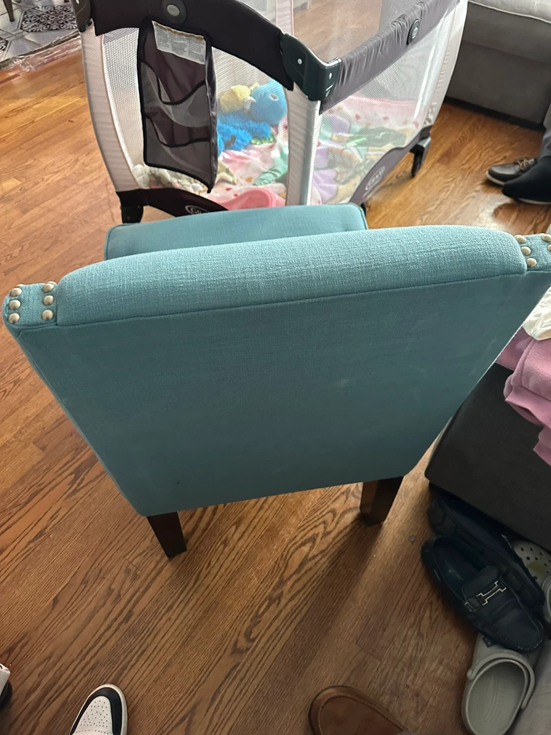 Light blue accent chair with nailhead trim in good condition! The chair is approximately 37 inches tall and 25 inches wide. Perfect for adding a pop of color to your living room or bedroom