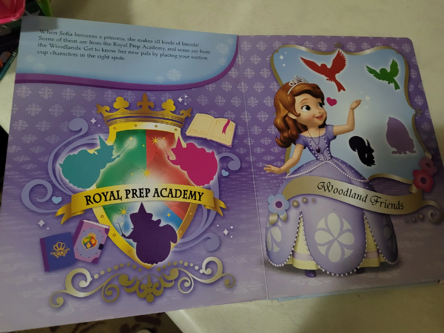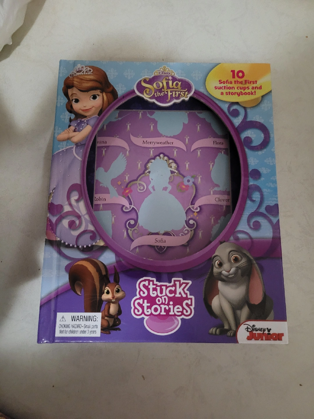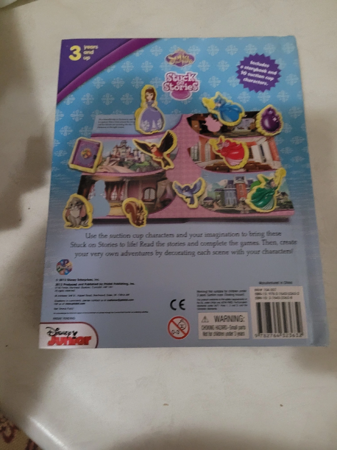 Sofia the First Stuck on Stories book includes a storybook and 10 suction cup characters! Use the suction cup characters and your imagination to bring these Stuck on Stories to life! Read the stories and complete the games. Then, create your very own adventures by decorating each scene with your characters!