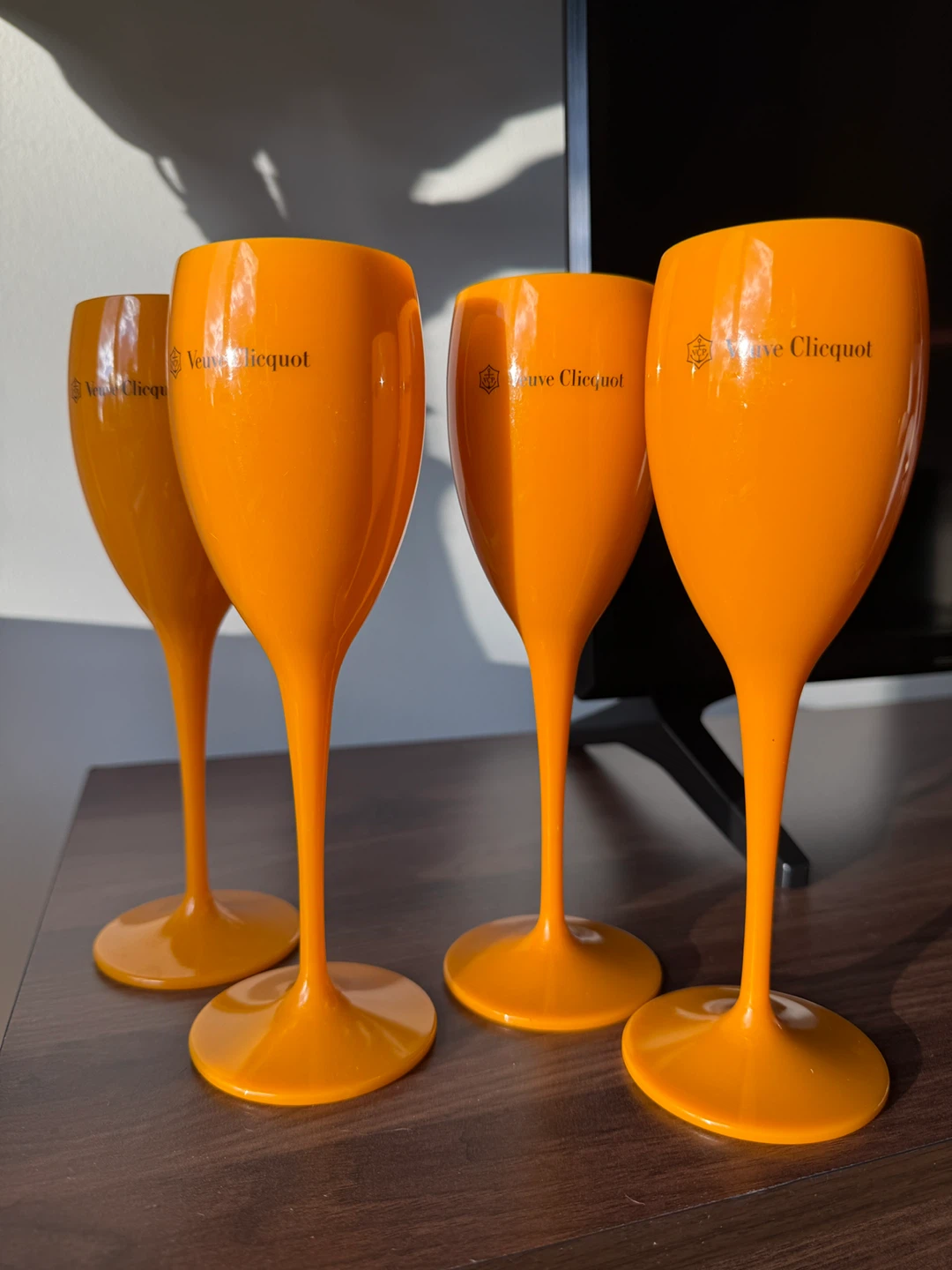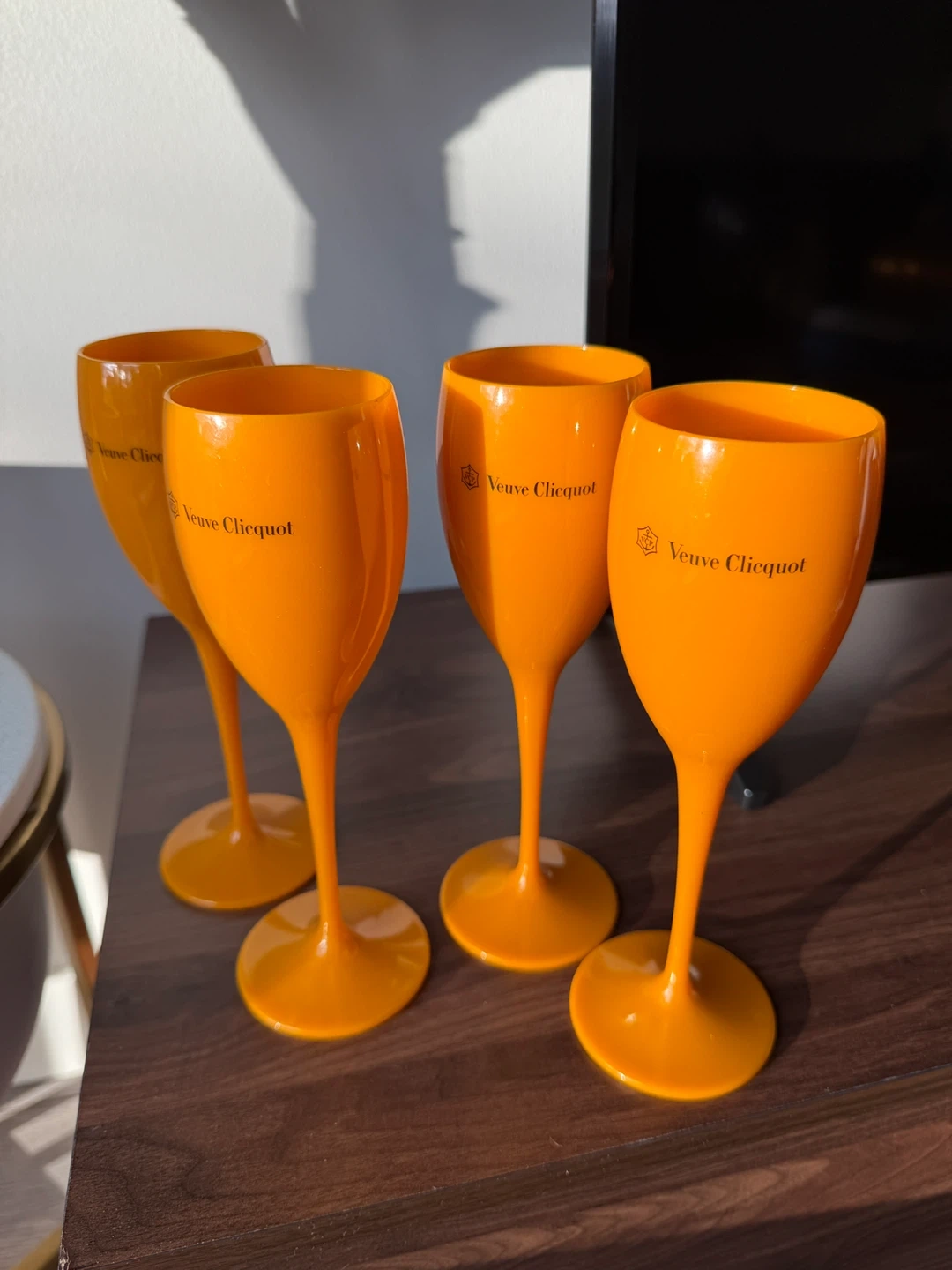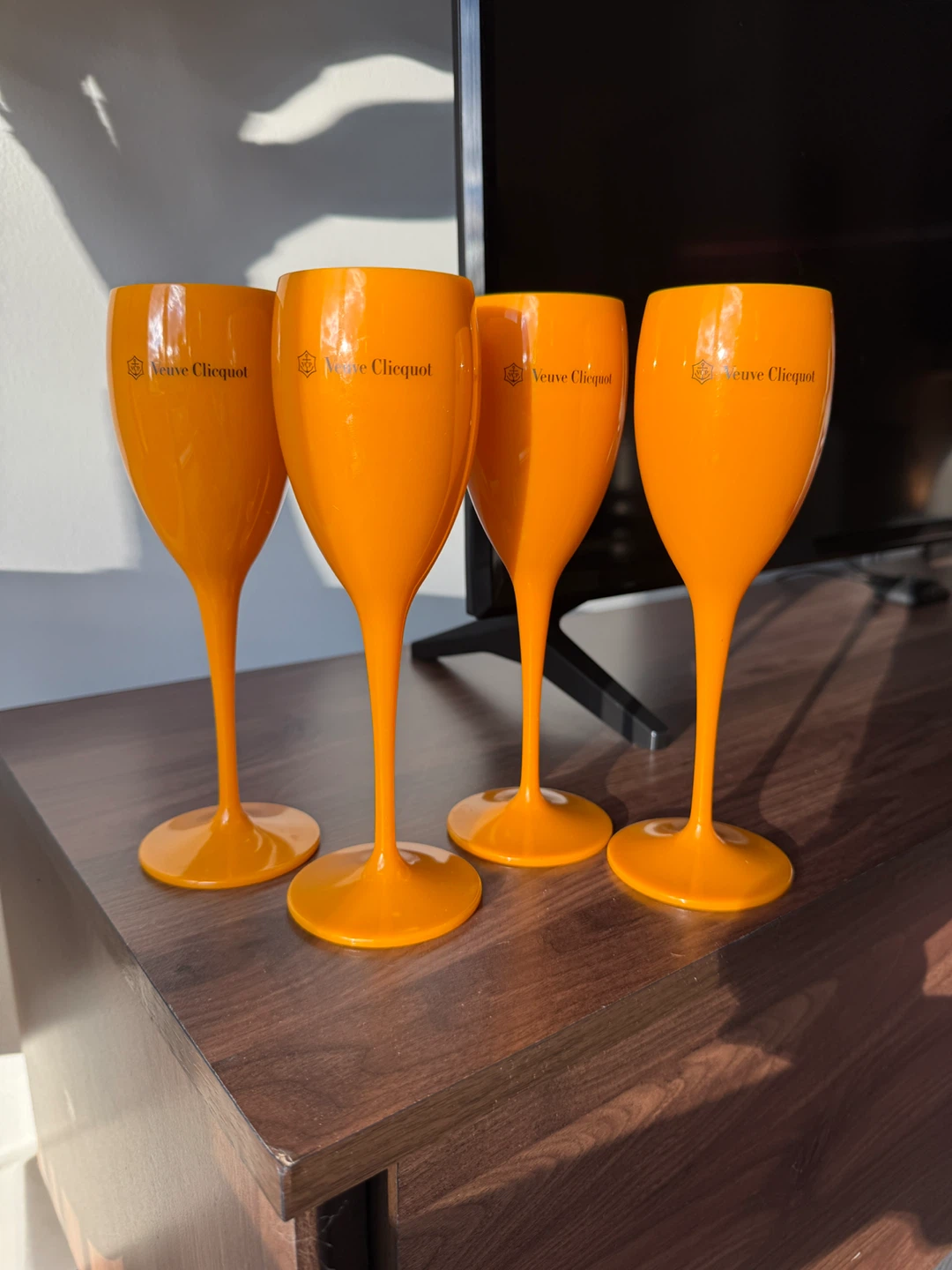 Selling a set of 4 Veuve Clicquot champagne flutes in the iconic orange color! These are perfect for adding a pop of color to your next celebration or gathering. They're in great condition and ready to be enjoyed