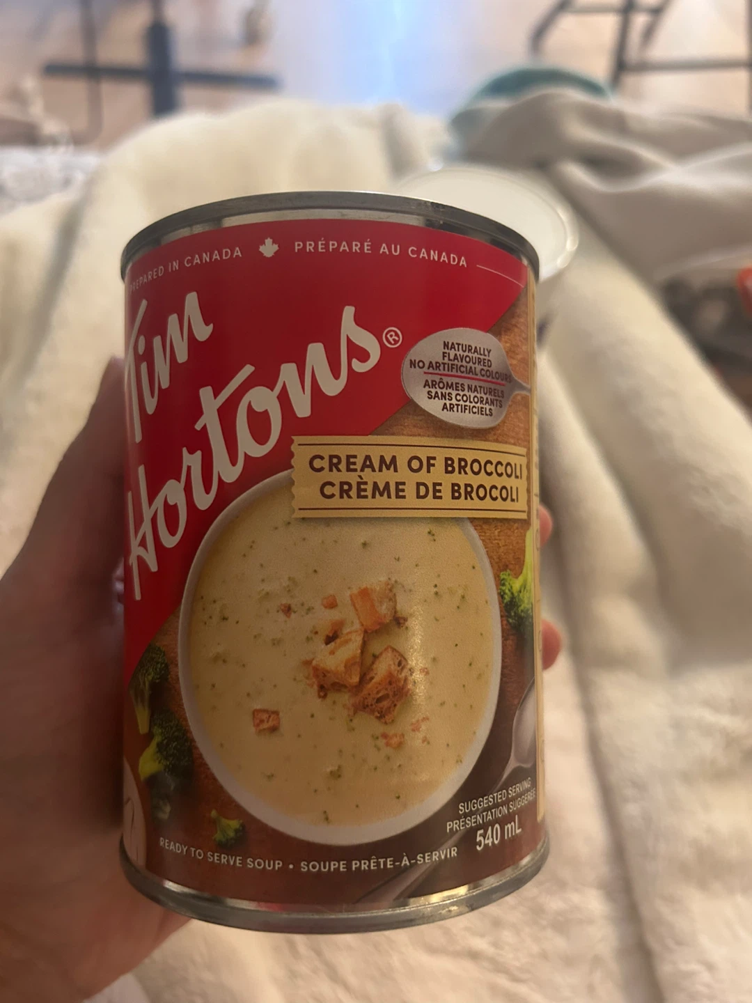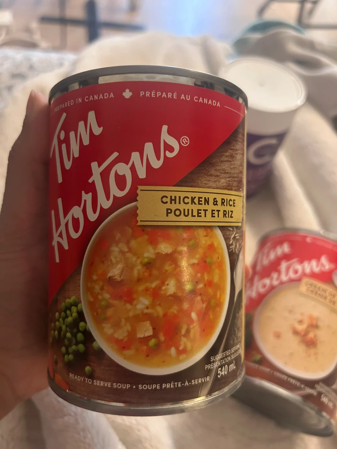 Selling two cans of Tim Hortons soup! One is Cream of Broccoli and the other is Chicken & Rice. Both are 540 mL cans. The expiration date is 2026