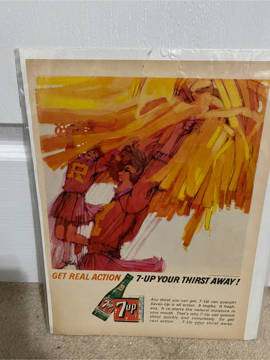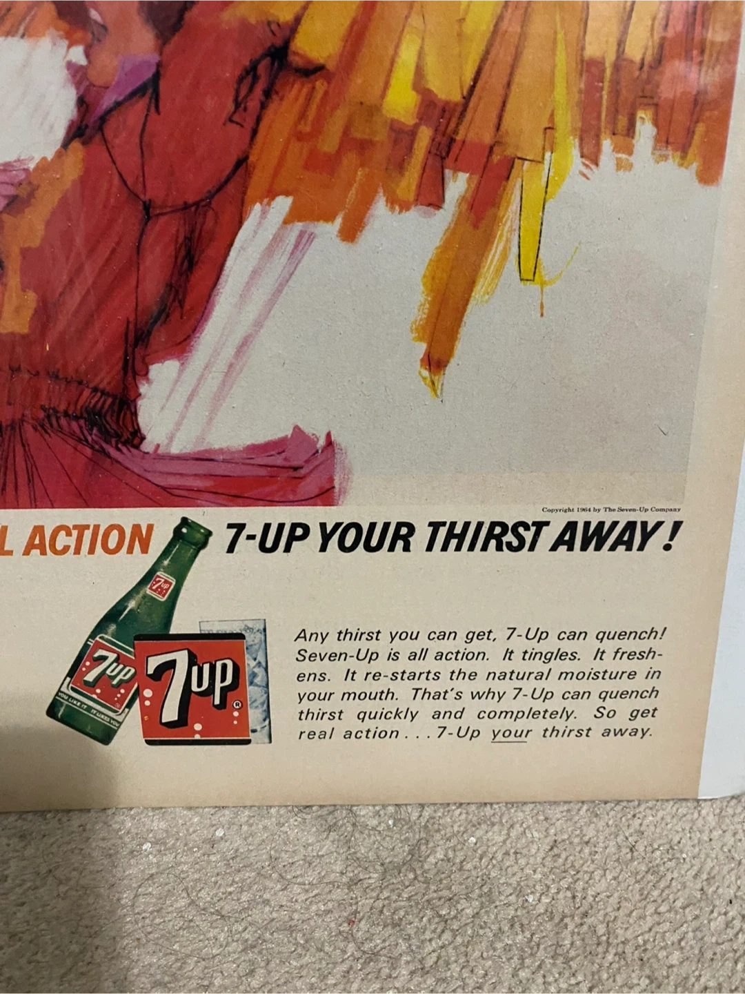 Selling a vintage 1964 7-Up advertisement print. It features a vibrant design promoting 7-Up as a thirst quencher. The print includes the classic 7-Up logo and slogan, "Get Real Action 7-Up Your Thirst Away!" A great piece for collectors or anyone looking to add a retro touch to their decor